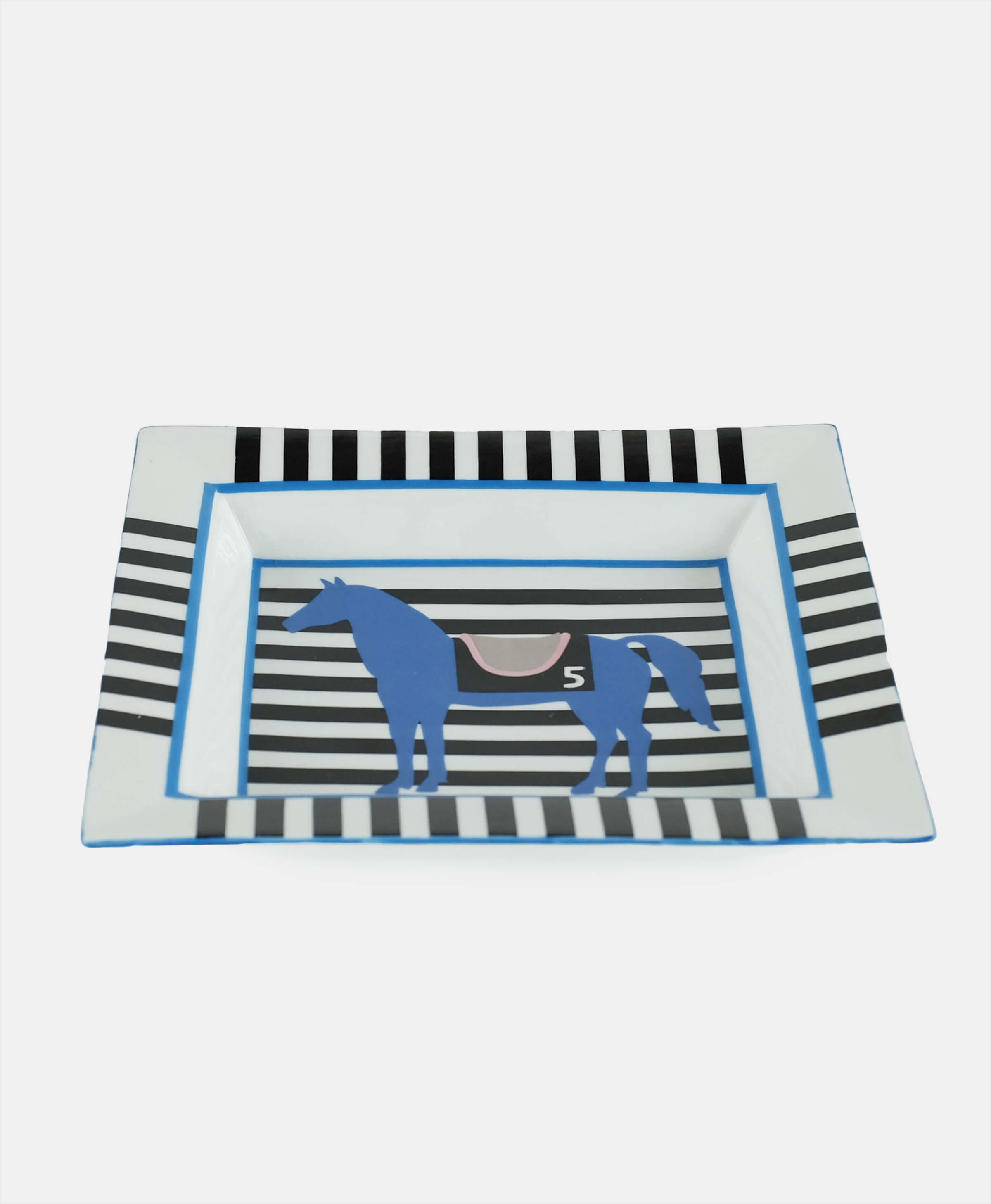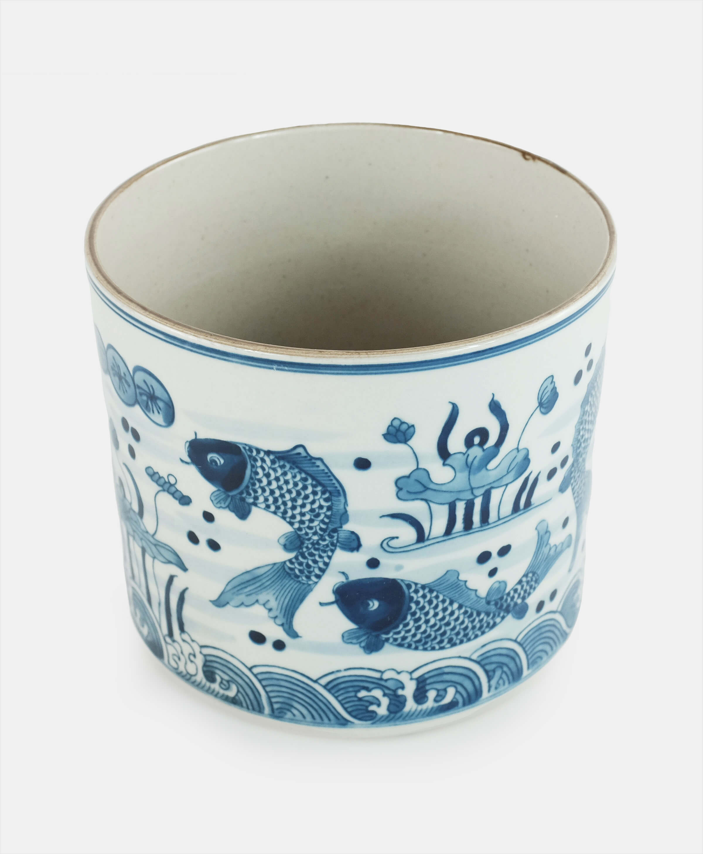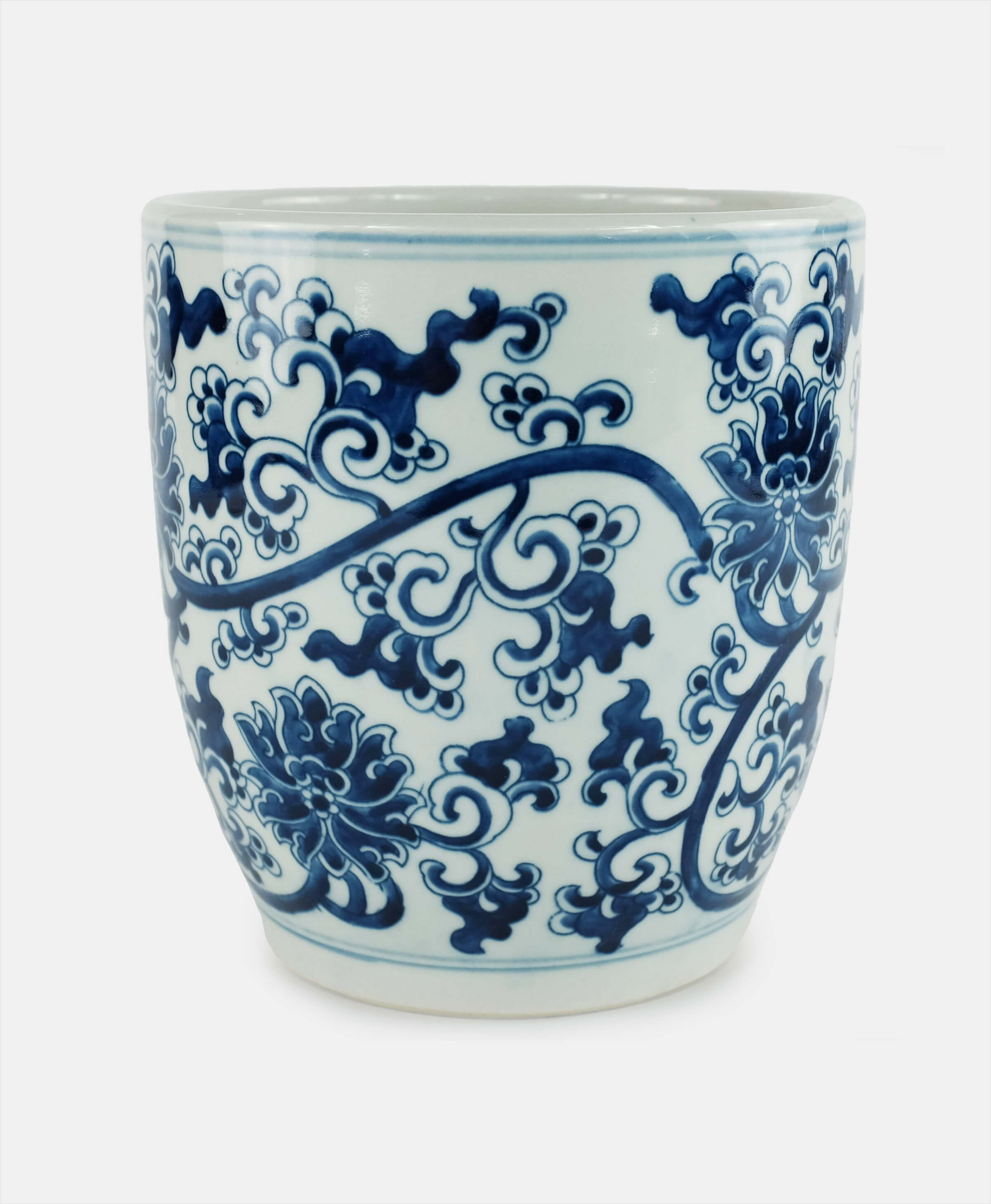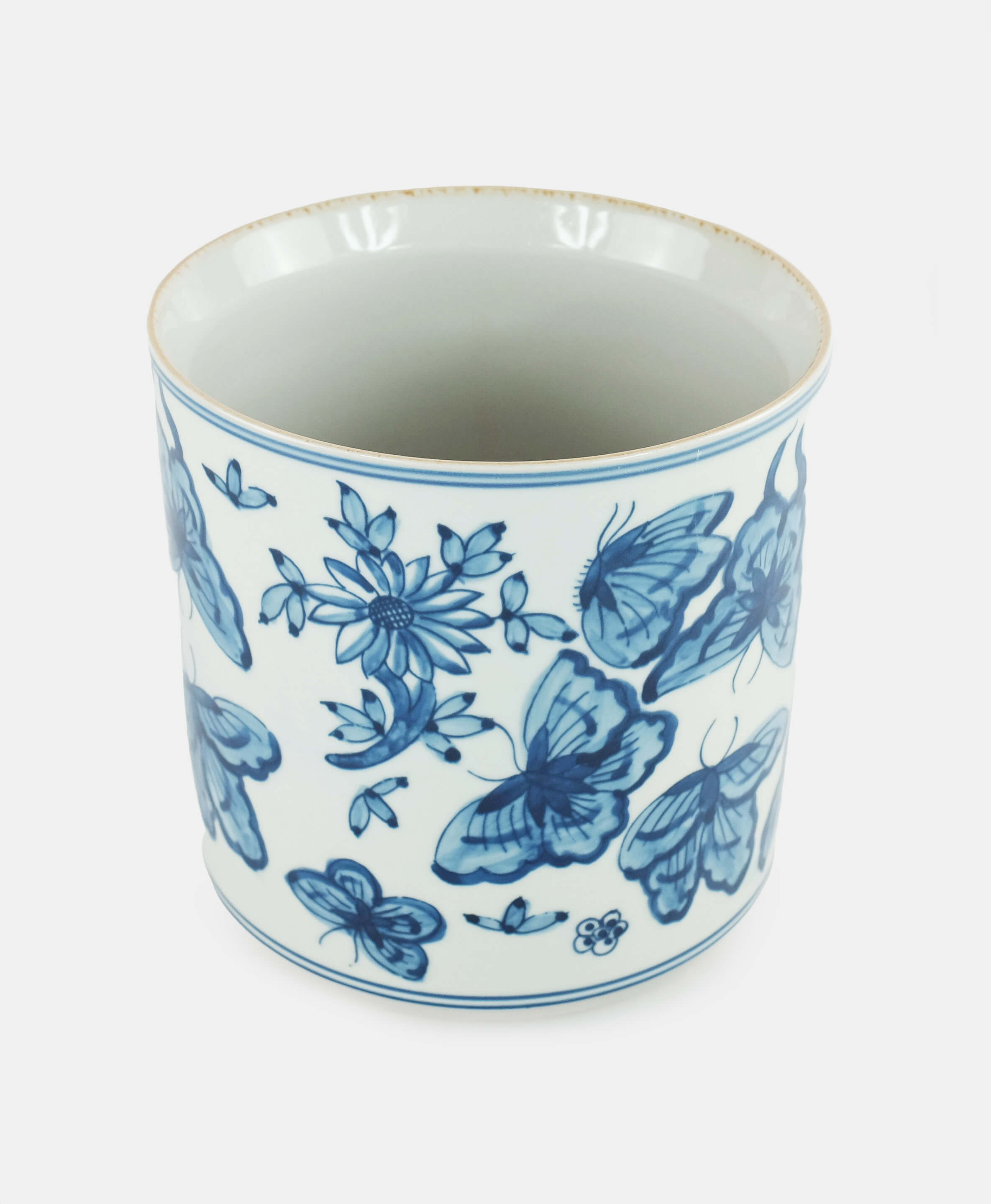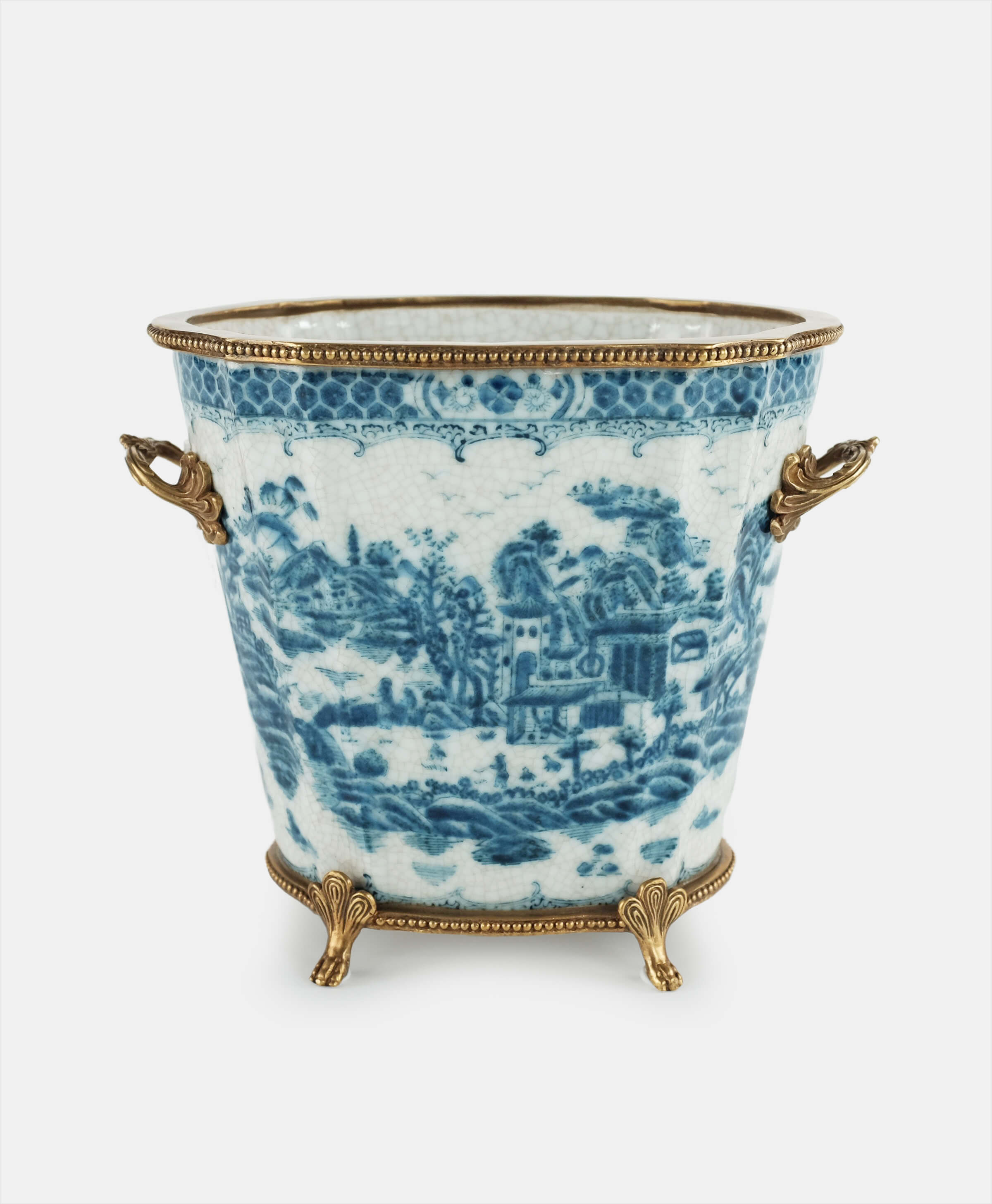 White and Blue Cachepot with Bronze Handles in Porcelain