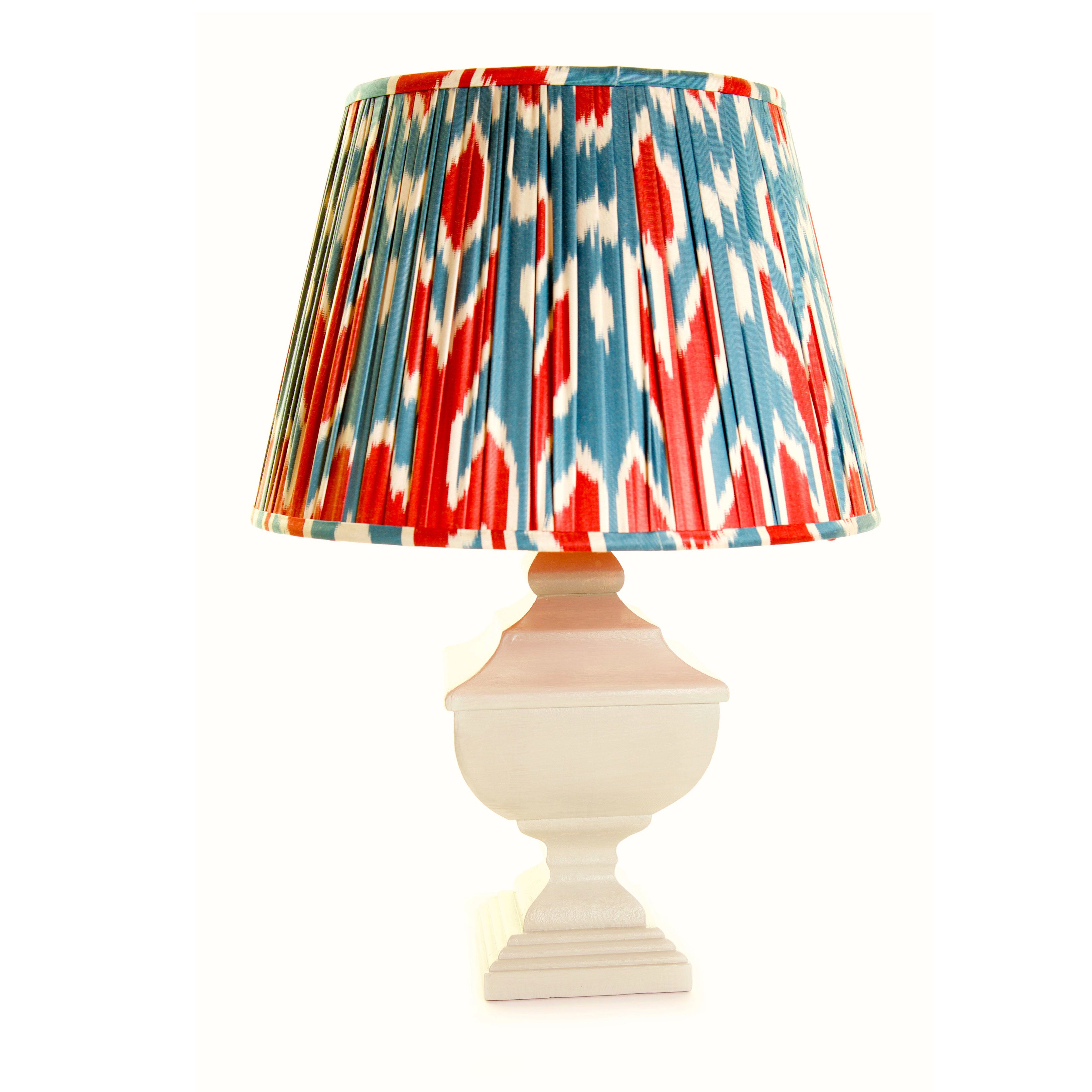 The IKAT fabric gives this lampshade a cosmopolitan air of Eastern promise. Ideal for city living, cosy homes or even monochrome spaces adding just the right dash of colour. Perfect for acquired and sophisticated tastes. What makes Melodi Horne lampshades different from others is her signature trade mark, the taut, colored linen linings, which make each piece, one of a kind.