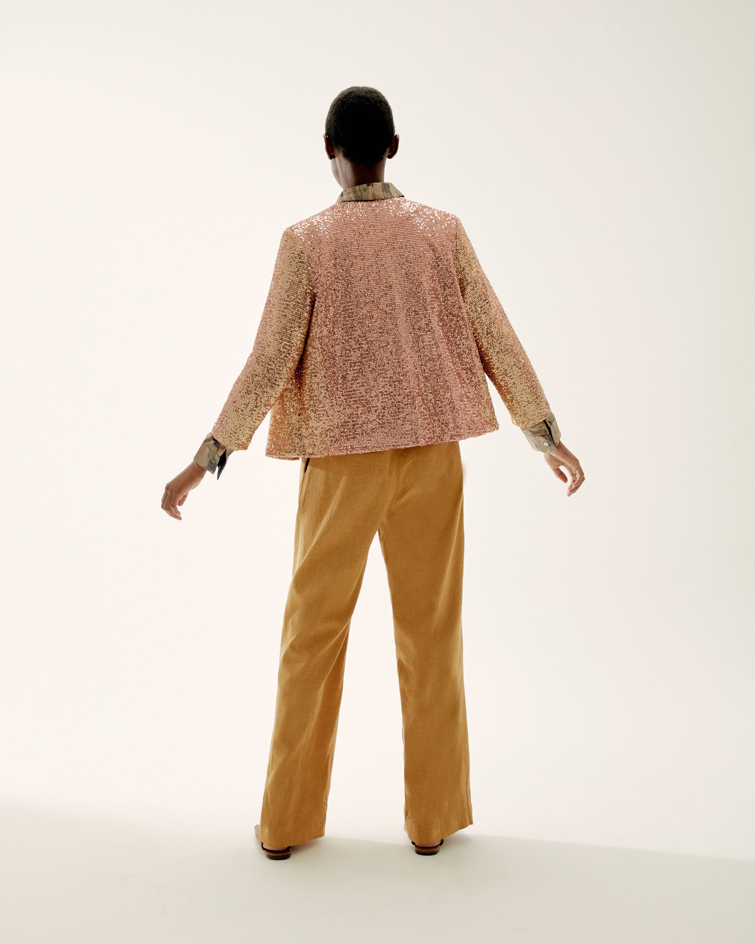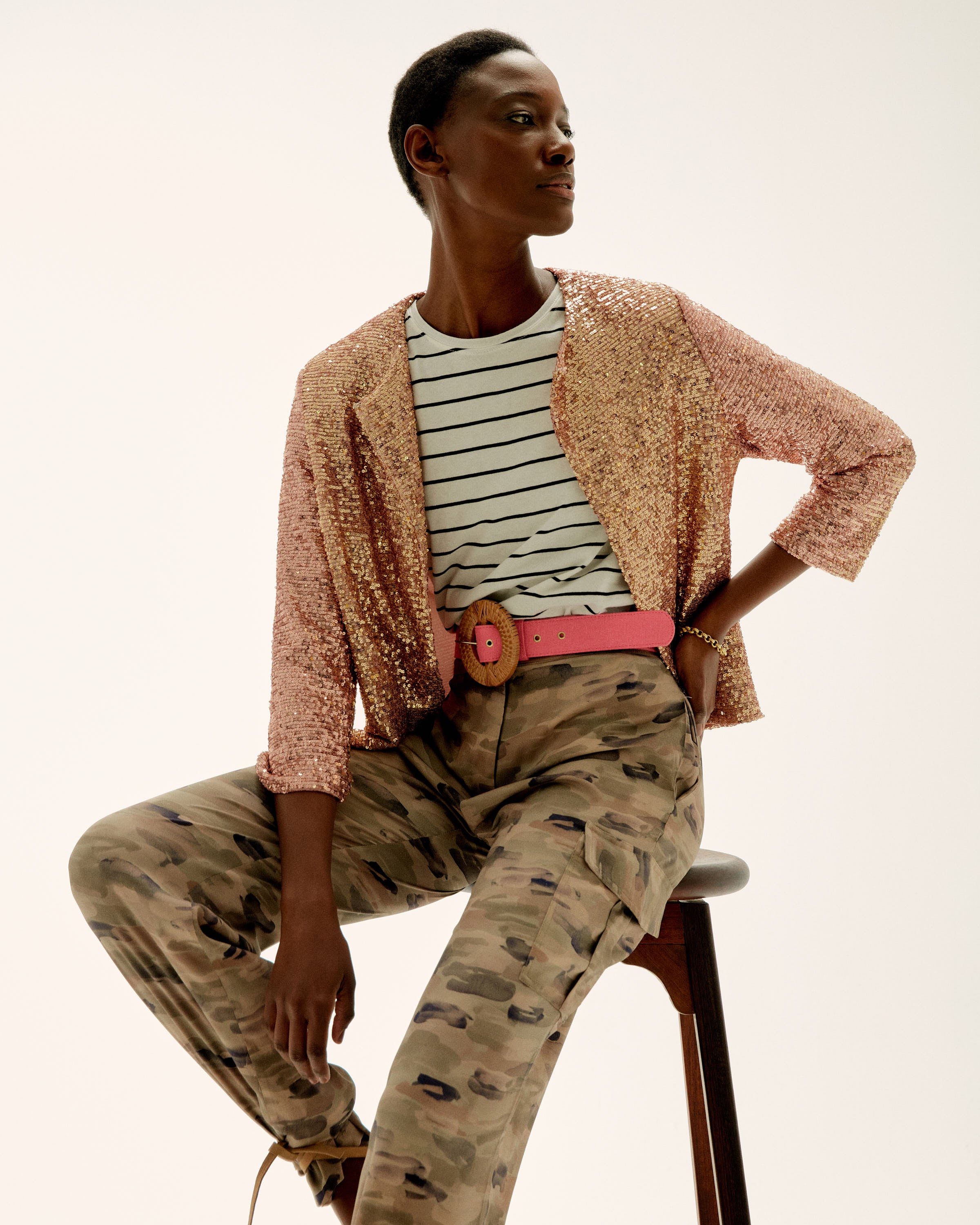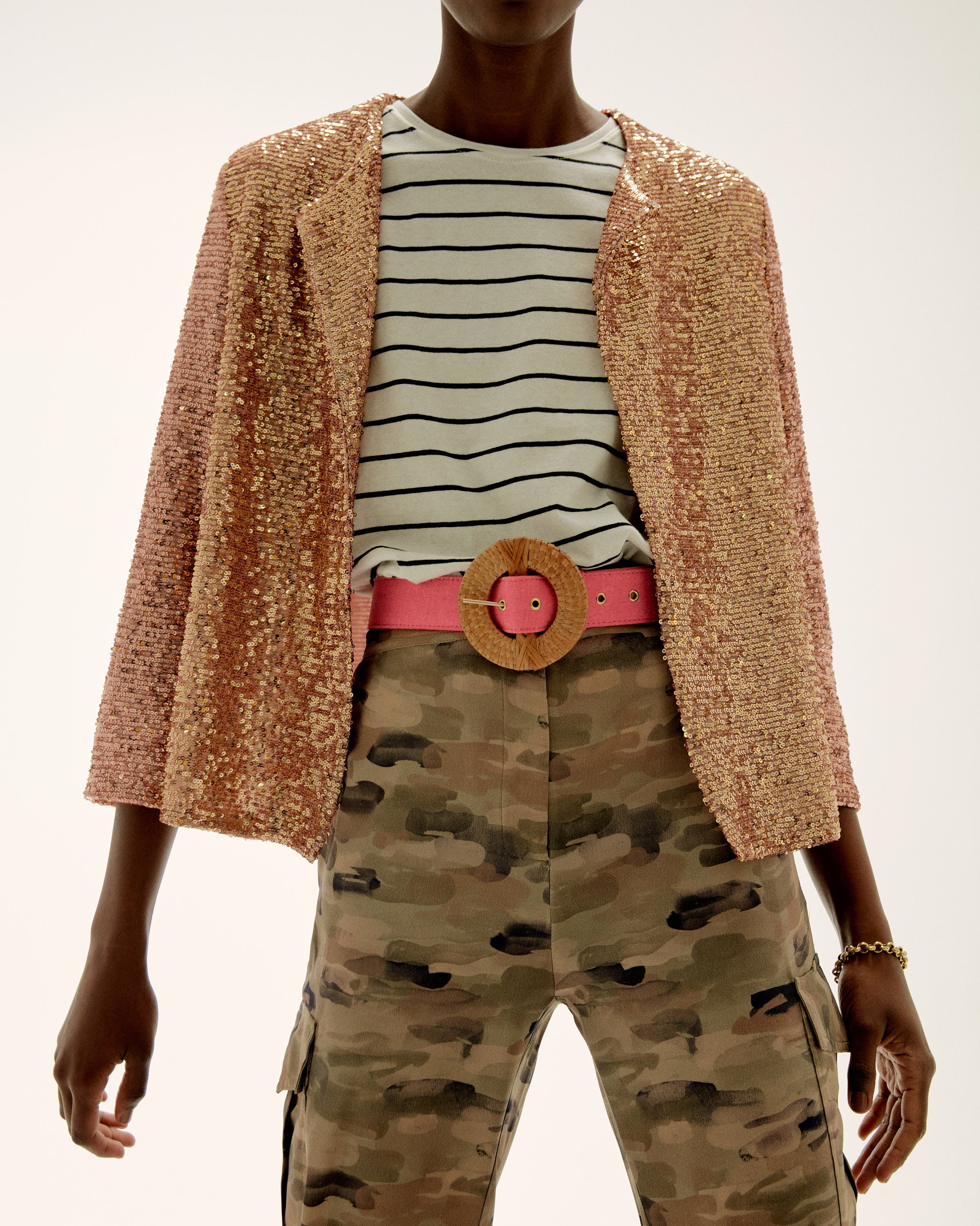 A staple piece in any wardrobe, the Copacabana Sequins Jacket can be casual and glamorous all at once. Cut in a collarless style and with bracelet-length sleeves, it can be dressed up or down and will always look great. Style it with jeans and a tee for a modern, cool look or over a cocktail dress for a really glamorous night out. We love how the sequins compliment the collection’s camouflage print and the different textures when paired with the Ipanema Linen Pant.