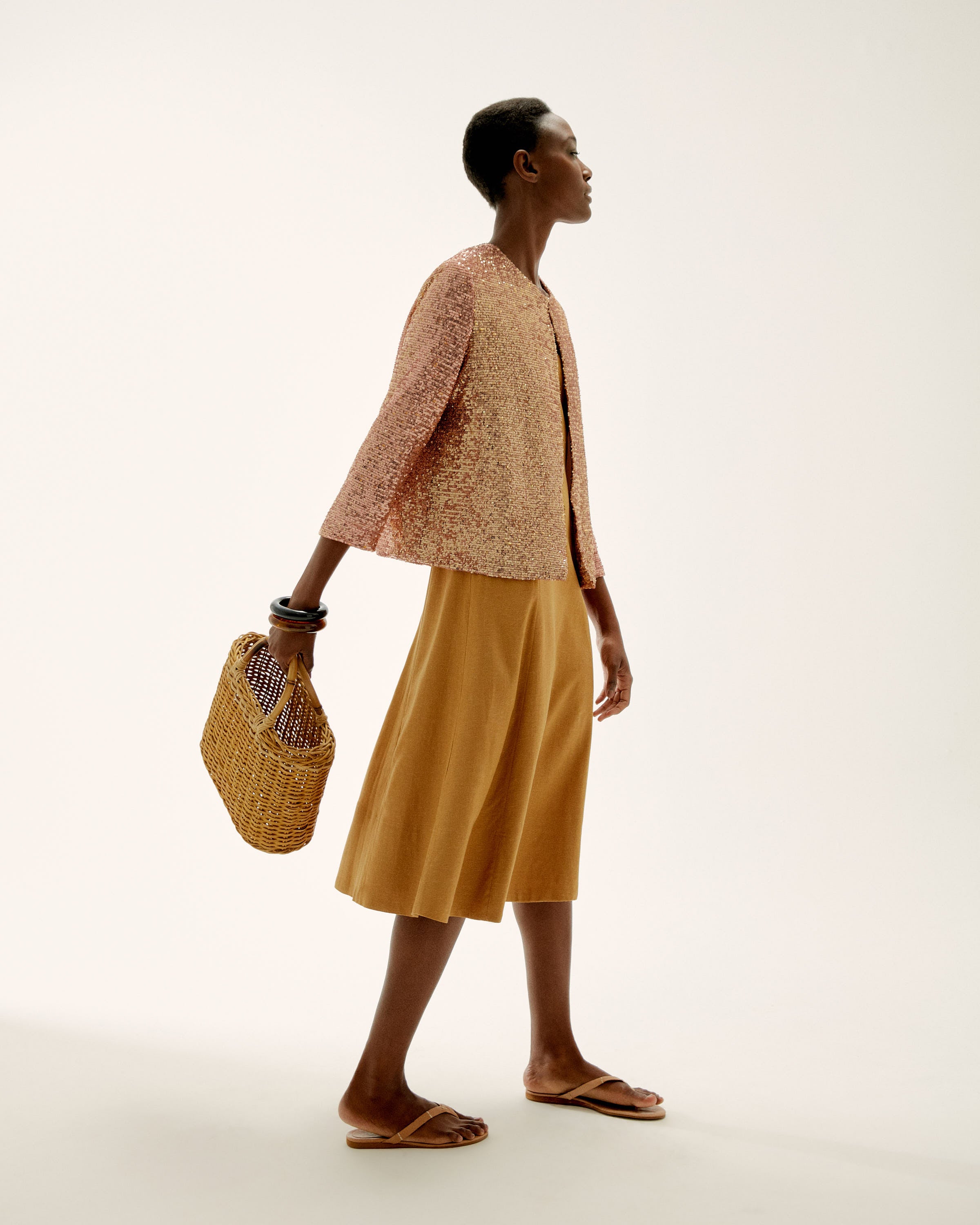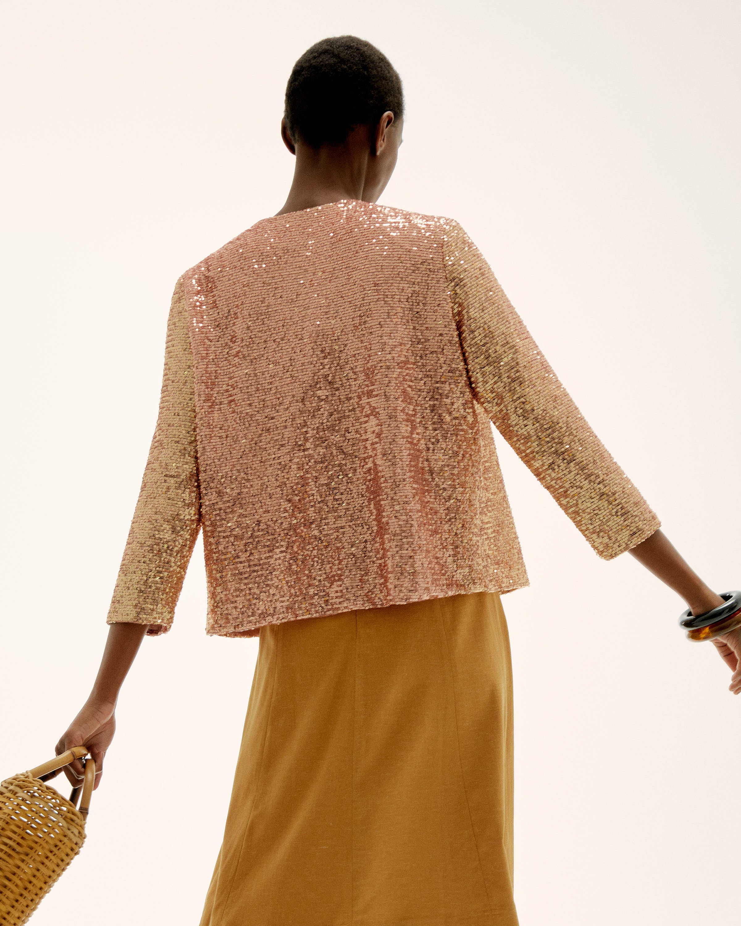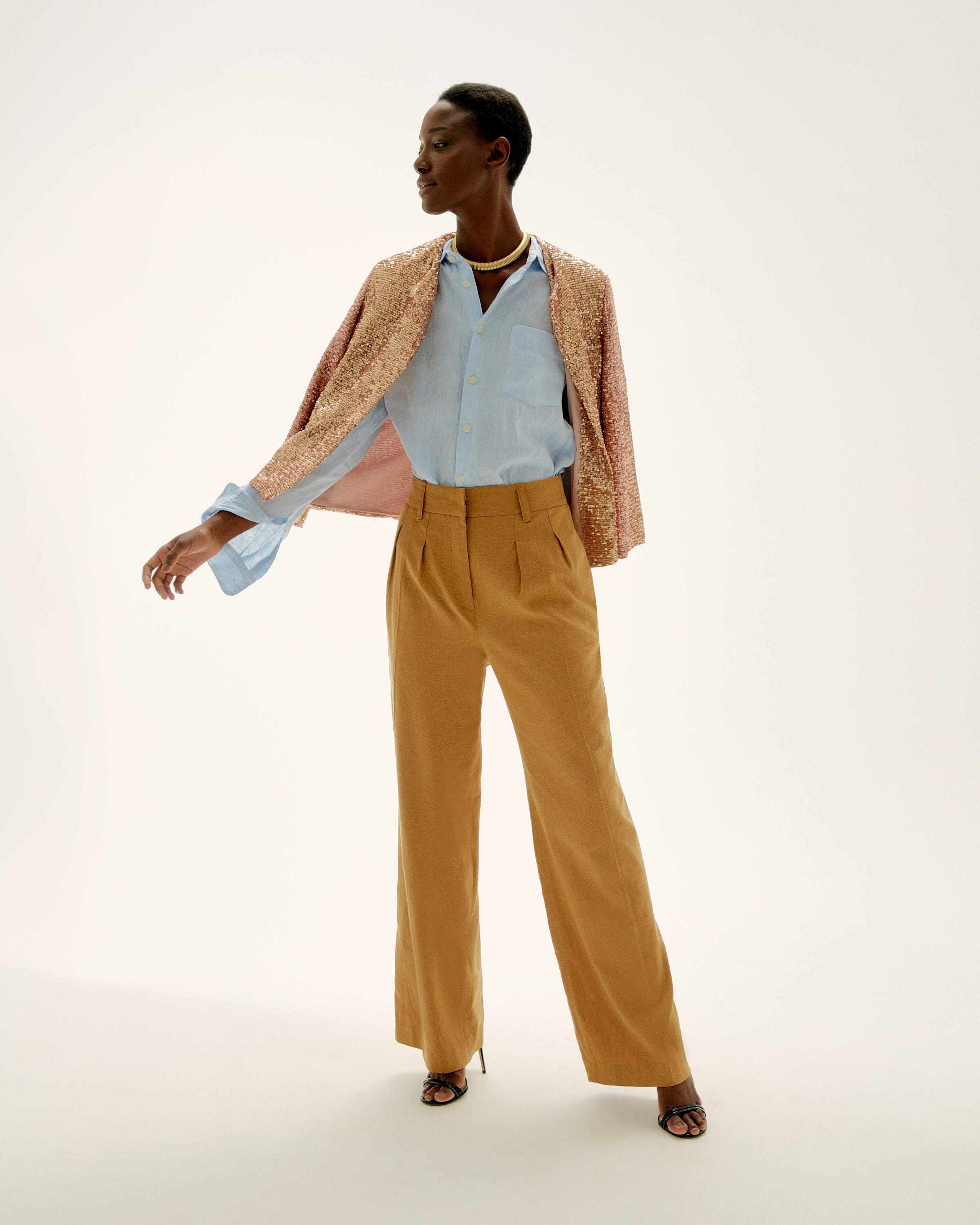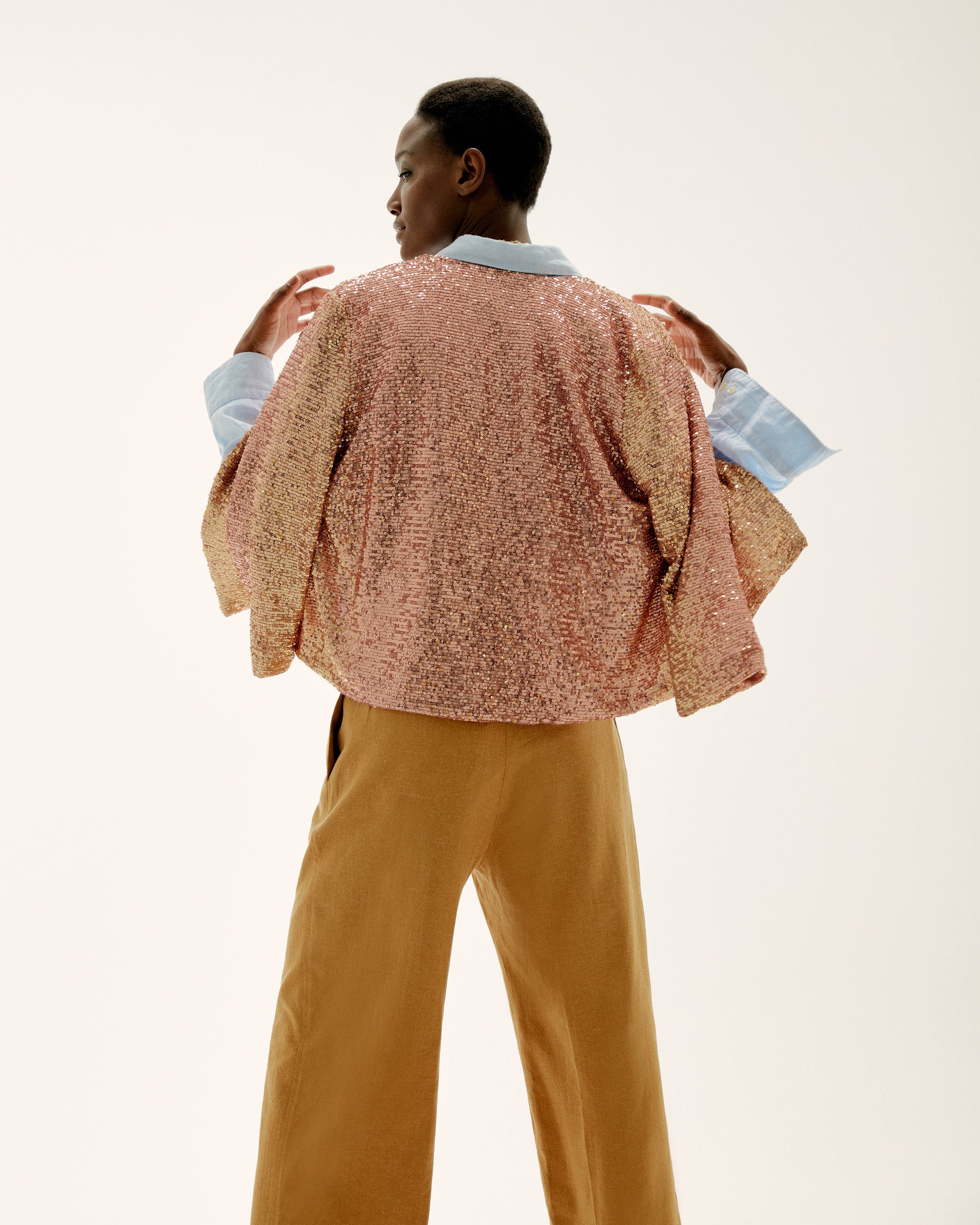 A staple piece in any wardrobe, the Copacabana Sequins Jacket can be casual and glamorous all at once. Cut in a collarless style and with bracelet-length sleeves, it can be dressed up or down and will always look great. Style it with jeans and a tee for a modern, cool look or over a cocktail dress for a really glamorous night out. We love how the sequins compliment the collection’s camouflage print and the different textures when paired with the Ipanema Linen Pant.
