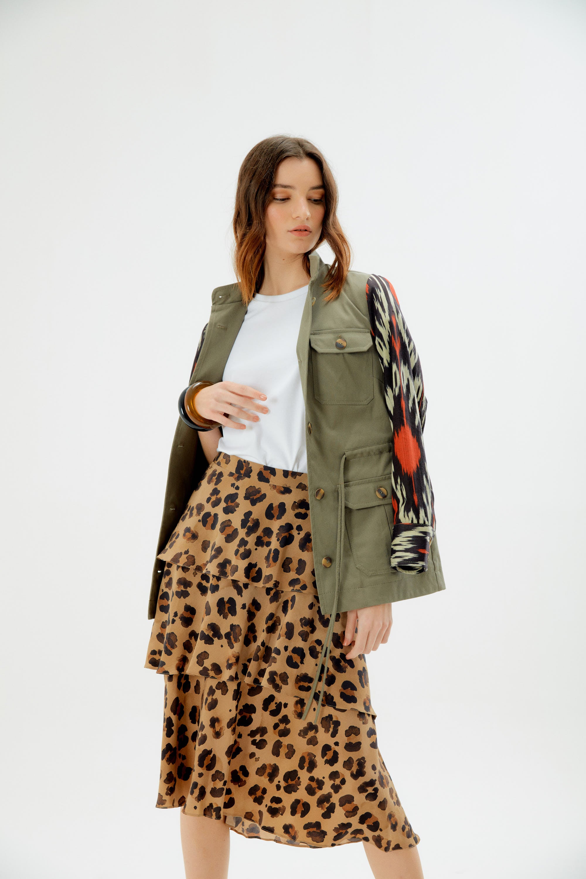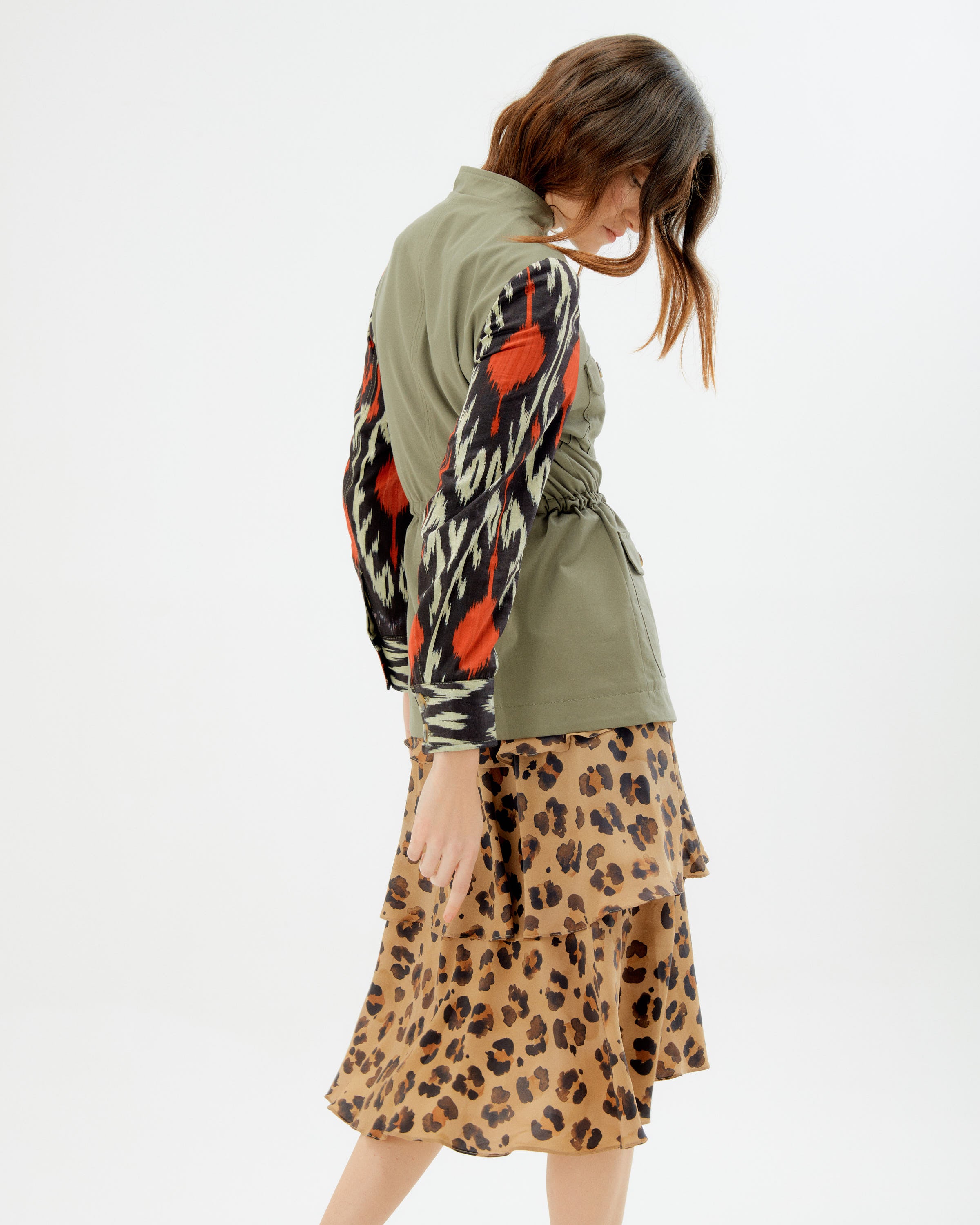 We never met an Army inspired jacket we didn't like, but this one is our "Pièce de Résistance". With sharp tailoring, this utility jacket features sleeves cut from handmade and hand dyed Ikat cotton, making each piece one of a kind and special. Perfect for layering over sweaters, cable knits and your favorite graphic tee, it has a slightly roomy shape that can be cinched at the waist for a more fitted look. This piece will become an instant wardrobe staple that you will want to wear again and again.