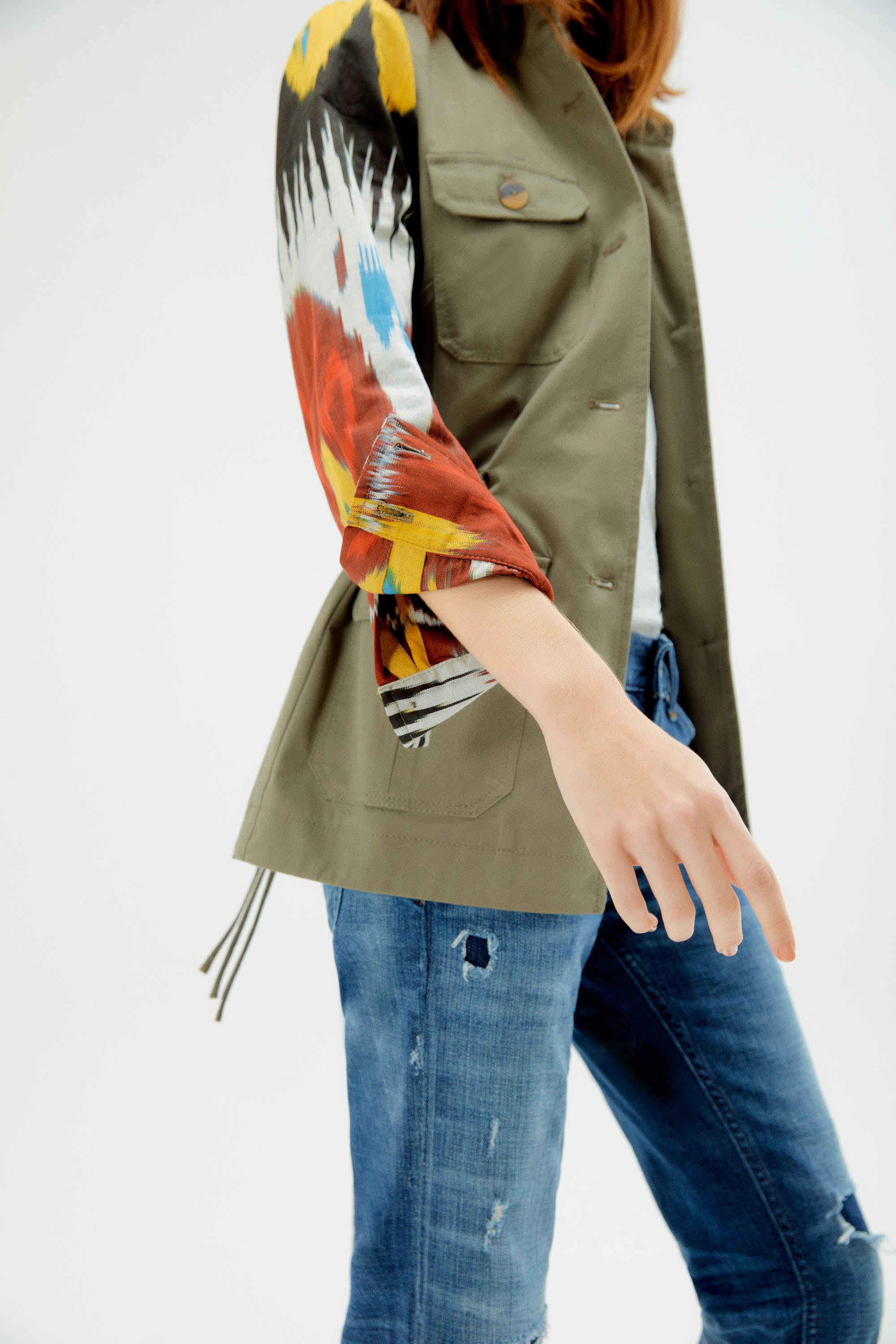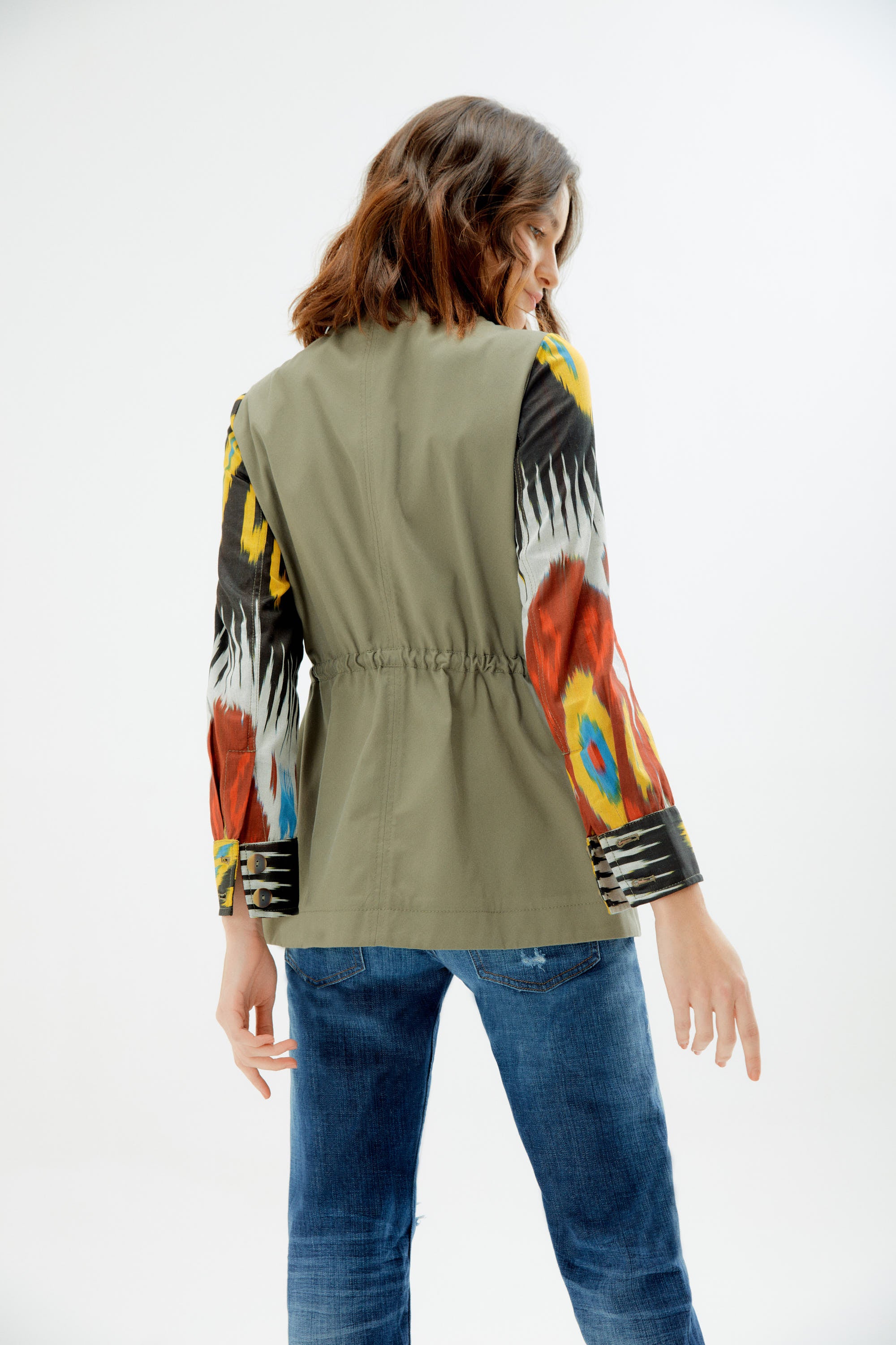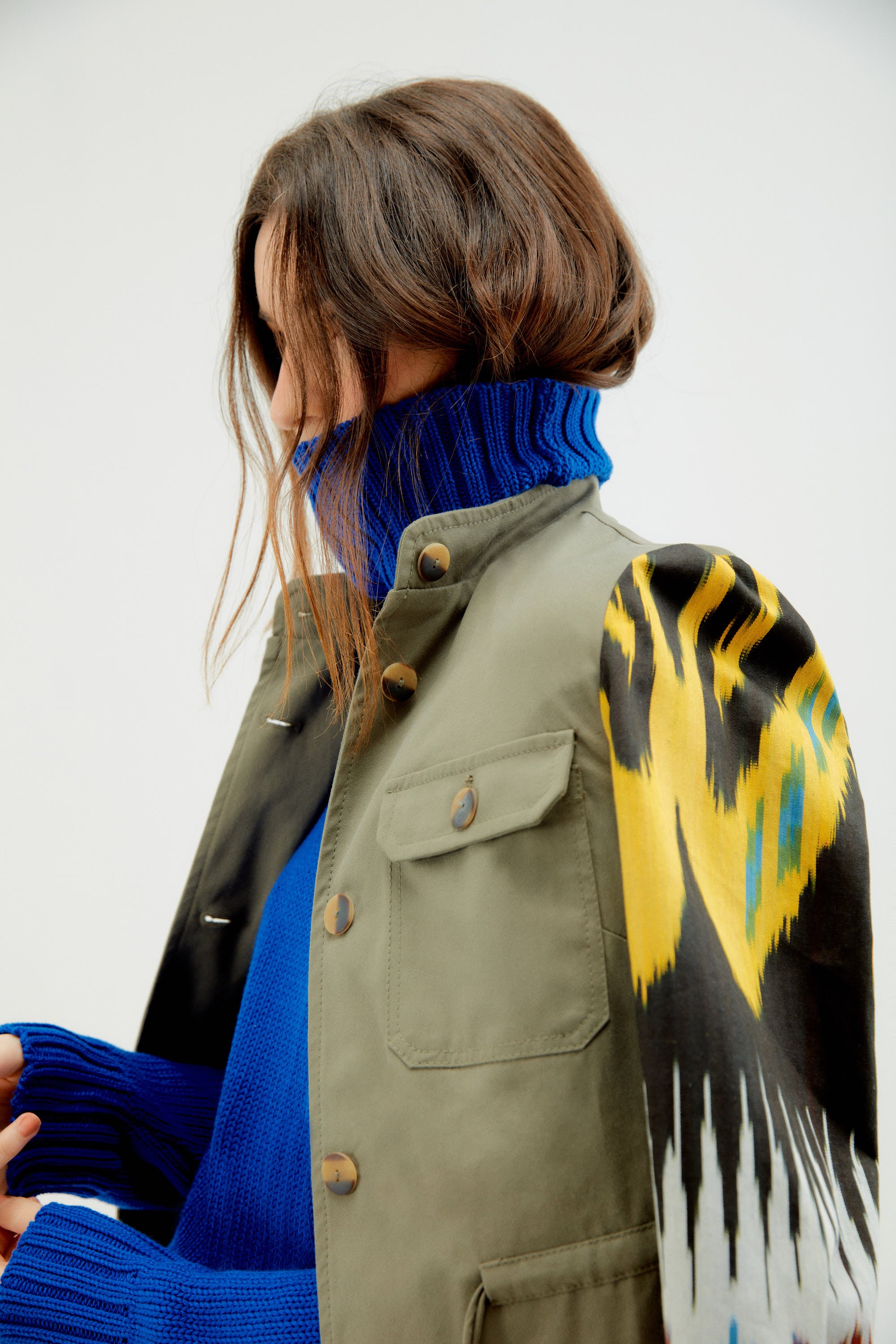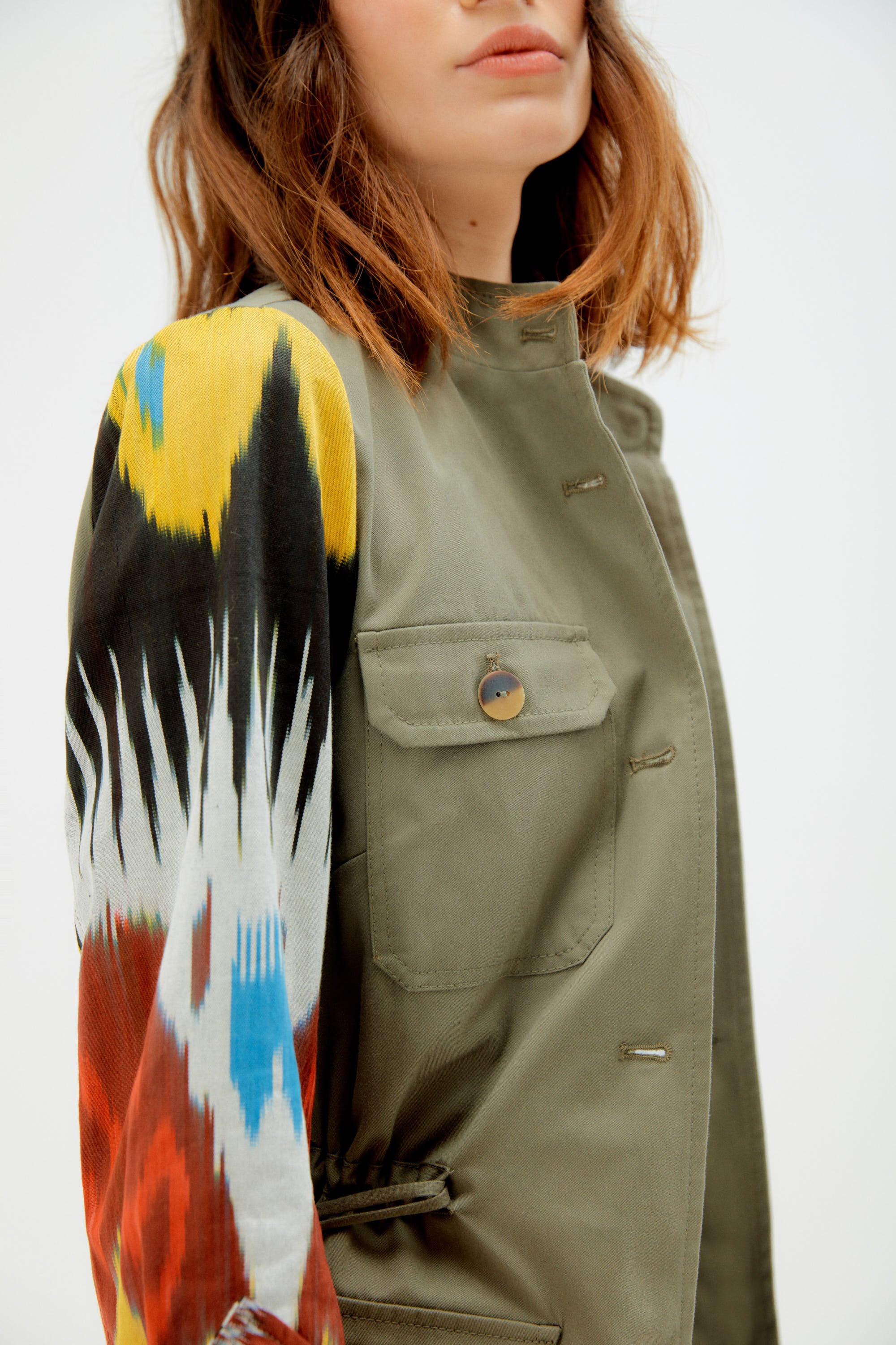 We never met an Army inspired jacket we didn't like, but this one is our "Pièce de Résistance". With sharp tailoring, this utility jacket features sleeves cut from handmade and hand dyed Ikat cotton, making each piece one of a kind and special. Perfect for layering over sweaters, cable knits and your favorite graphic tee, it has a slightly roomy shape that can be cinched at the waist for a more fitted look. This piece will become an instant wardrobe staple that you will want to wear again and again.