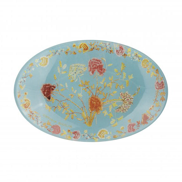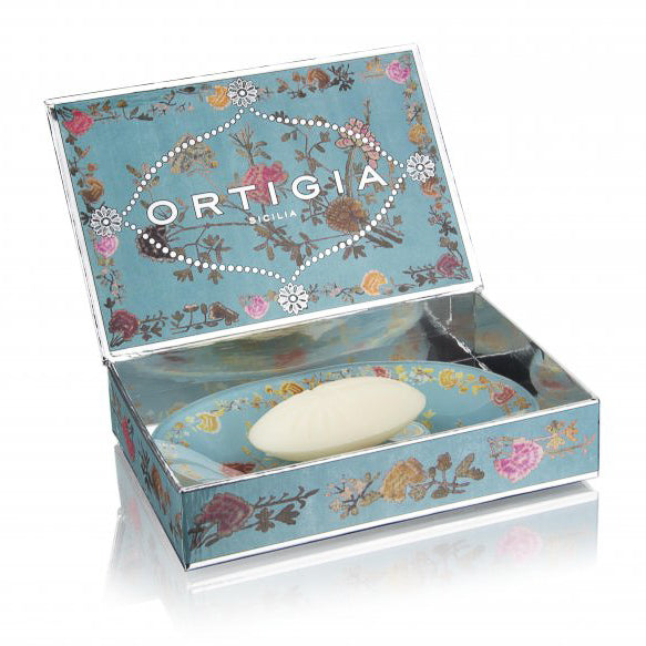 In a beautiful glass plate designed with an exclusive Ortigia print, lays a bar of classically luxurious triple milled olive oil soap, with almond oil and milk proteins in a breezy, clean scent of Sicily’s Spring flowers. Naturally colored, the olive oil, almond oil and milk protein nourishes the skin. Perfect to add elegance to a powder room, the Florio Glass Plate & Soap is a great hostess gift.