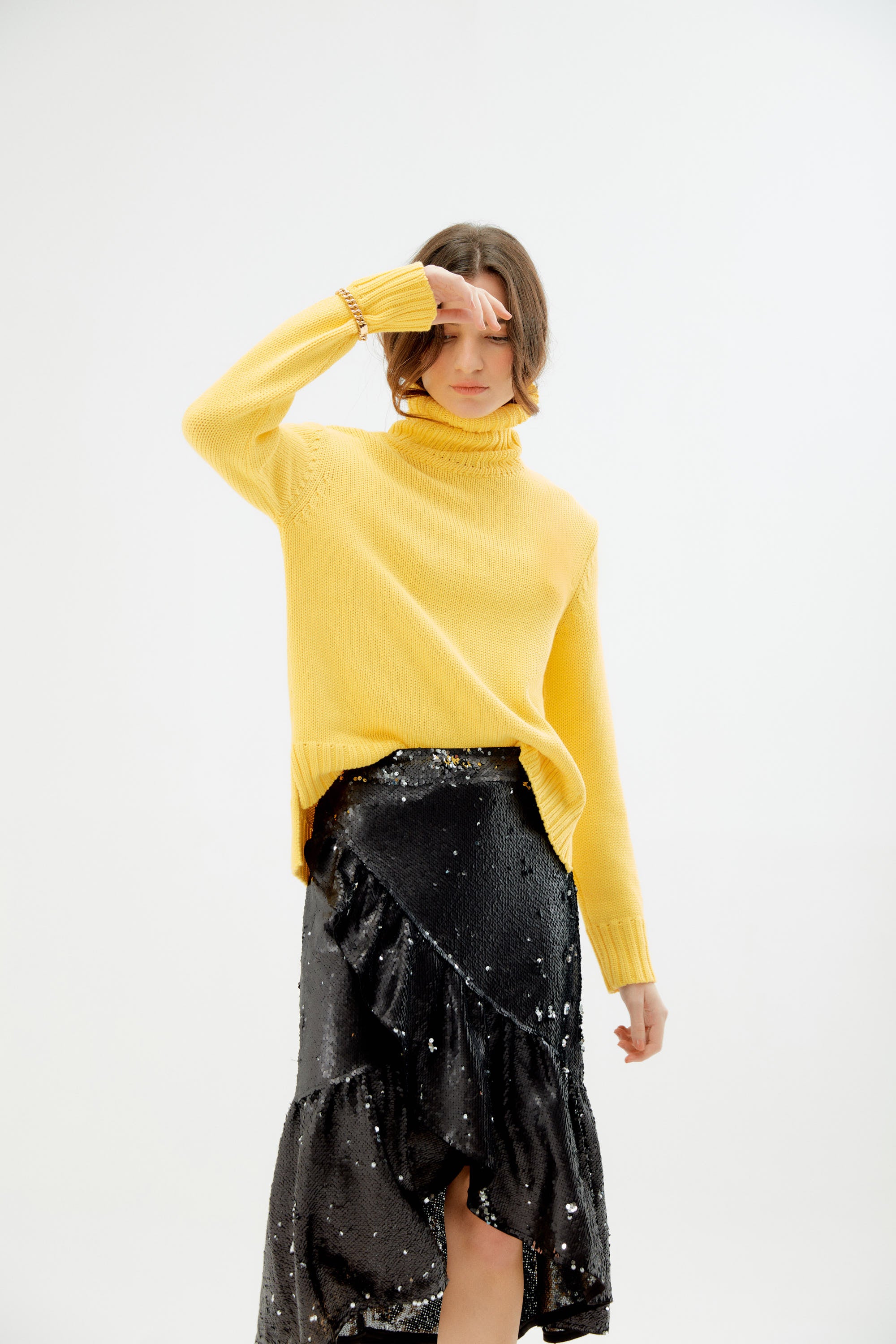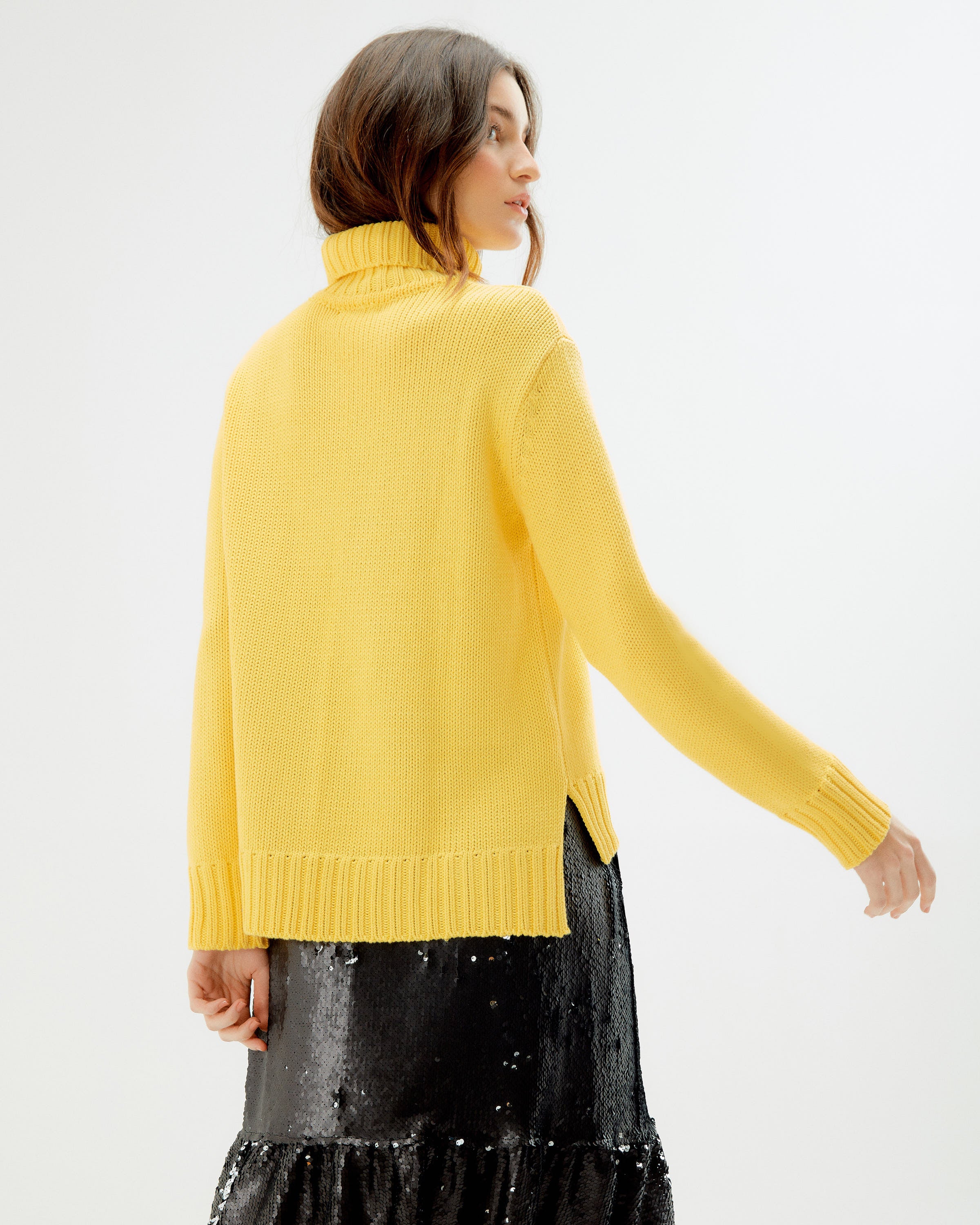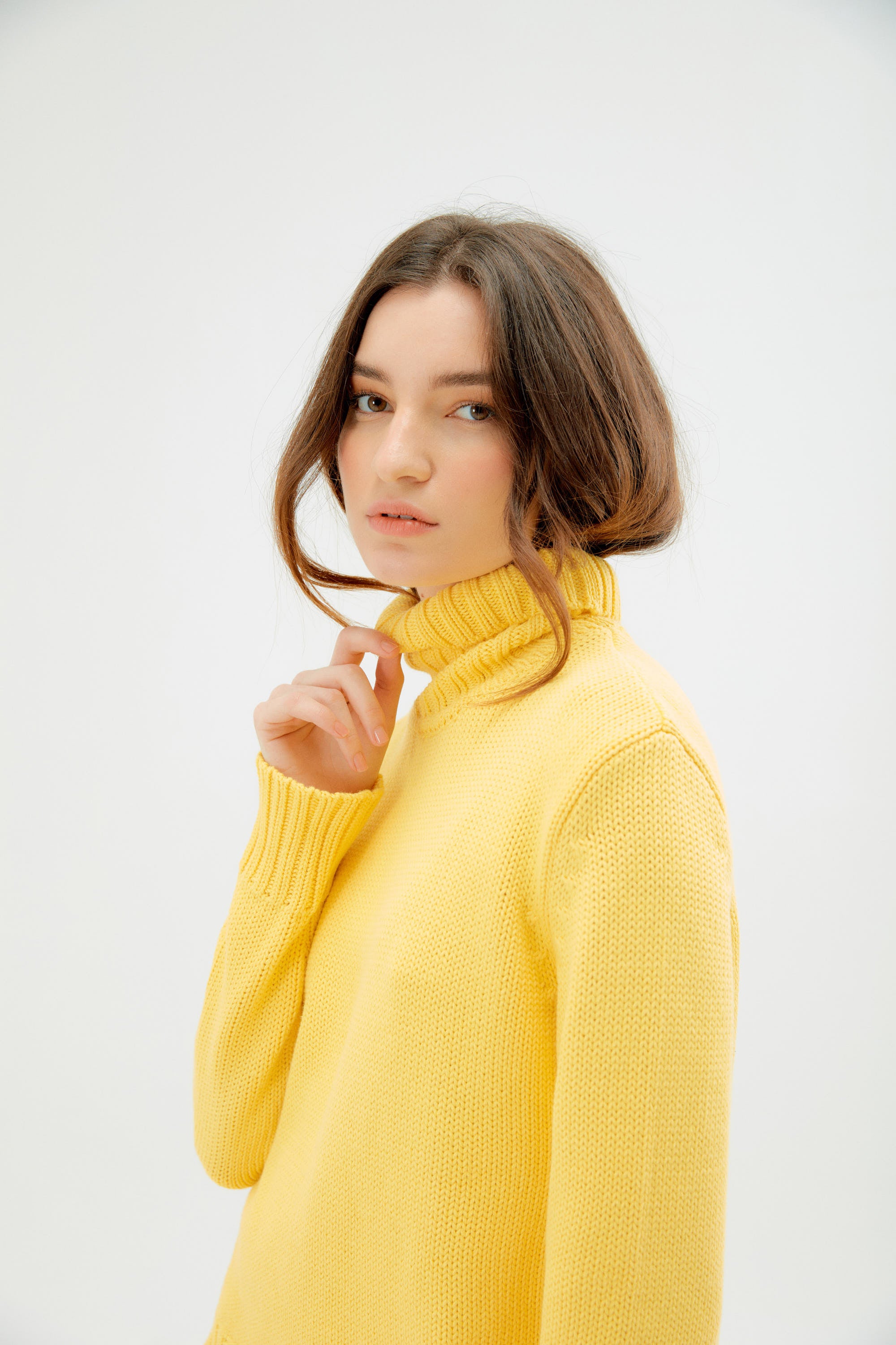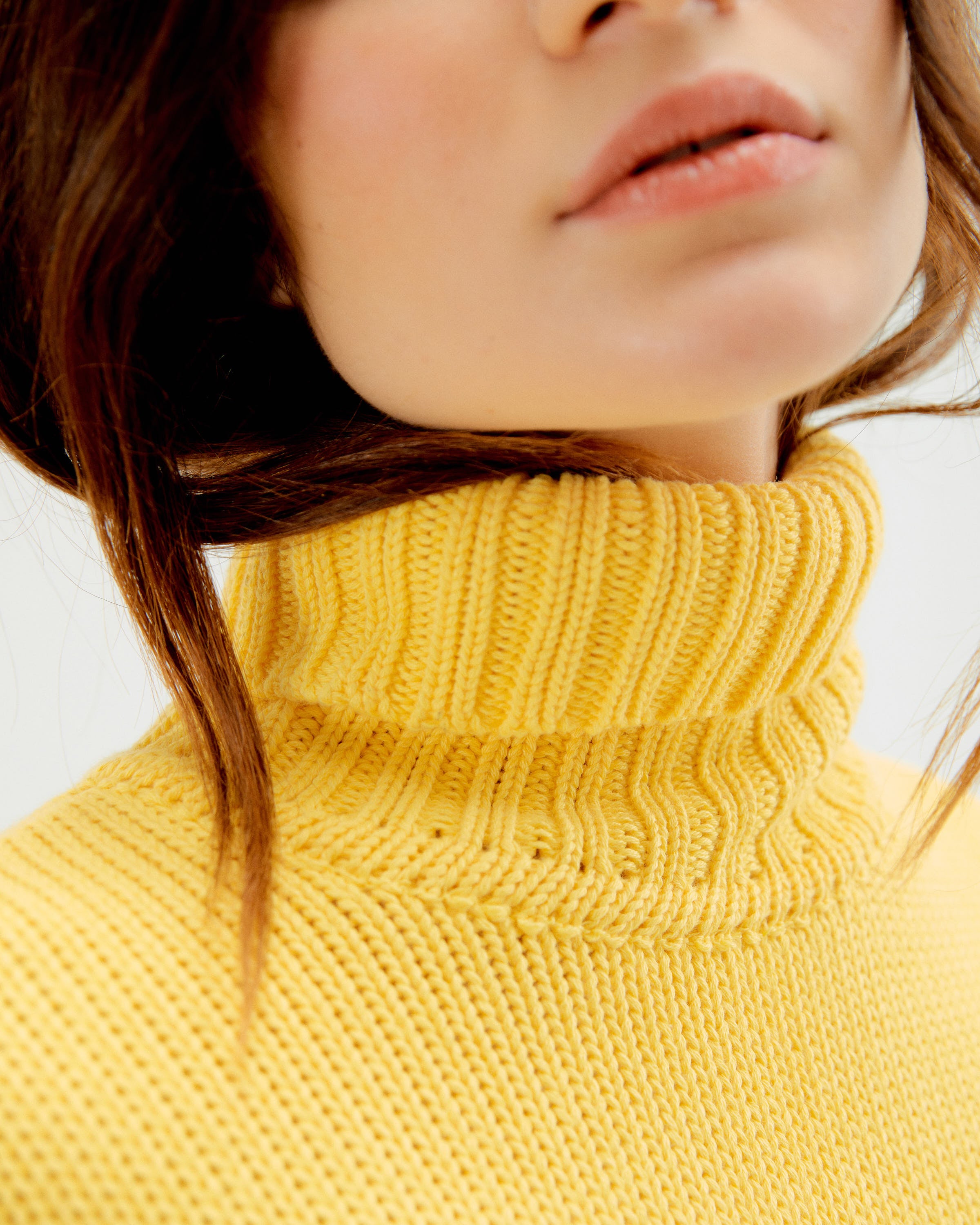 Handcrafted in the perfect hue of yellow, this rib knit will bring sunshine to your looks. Slightly oversized, it's the perfect companion to your every day jeans and pair beautifully with skirts and over dresses. With a chunky collar for extra cozy, you can leave it unfolded around your neck for a casual, understated look or gently turned down for a more pulled together feel. The side slits help you style it tucked in or loose for more easy styling options. The shoulders are gently dislocated and the sleeves are long enough to wear them folded.