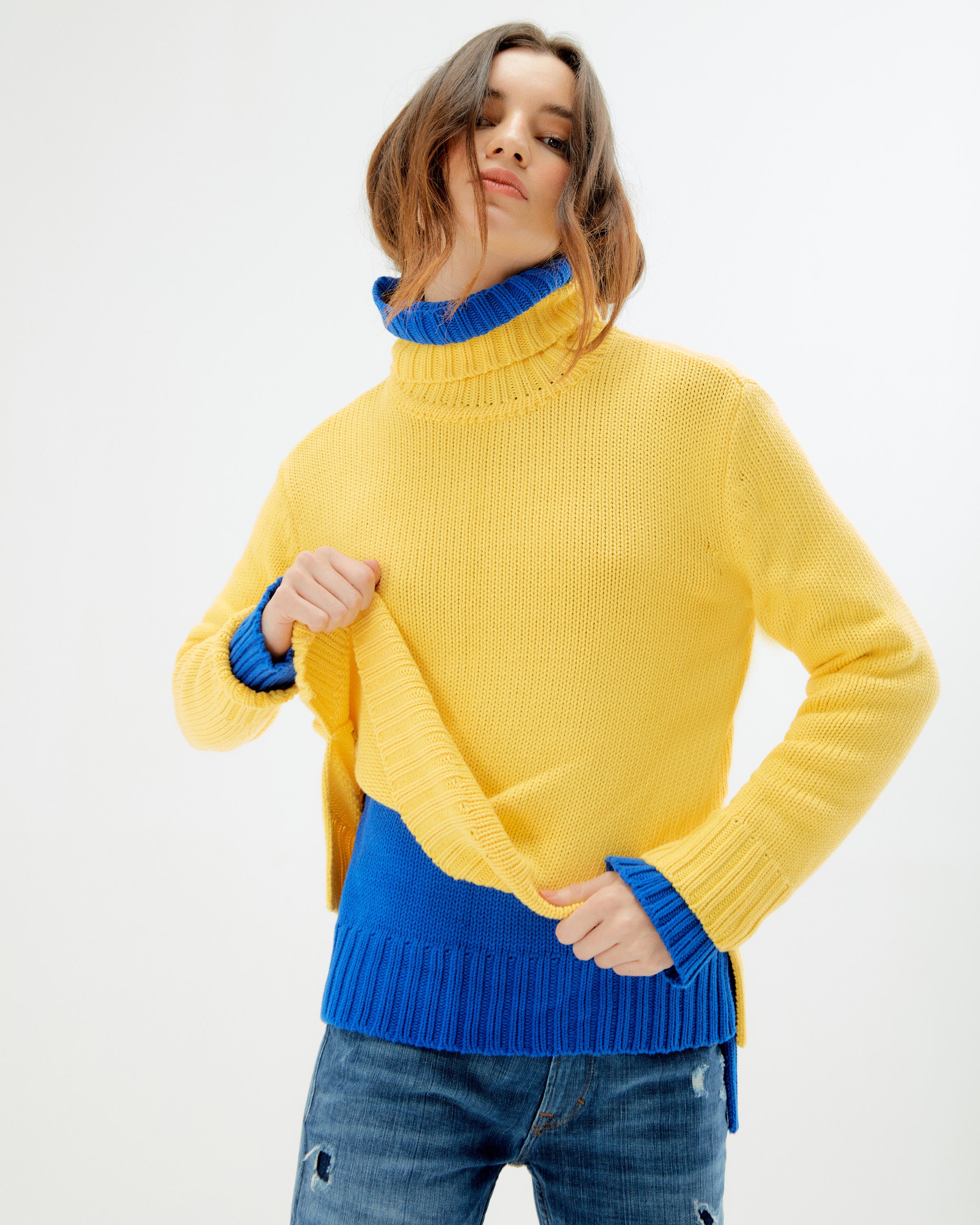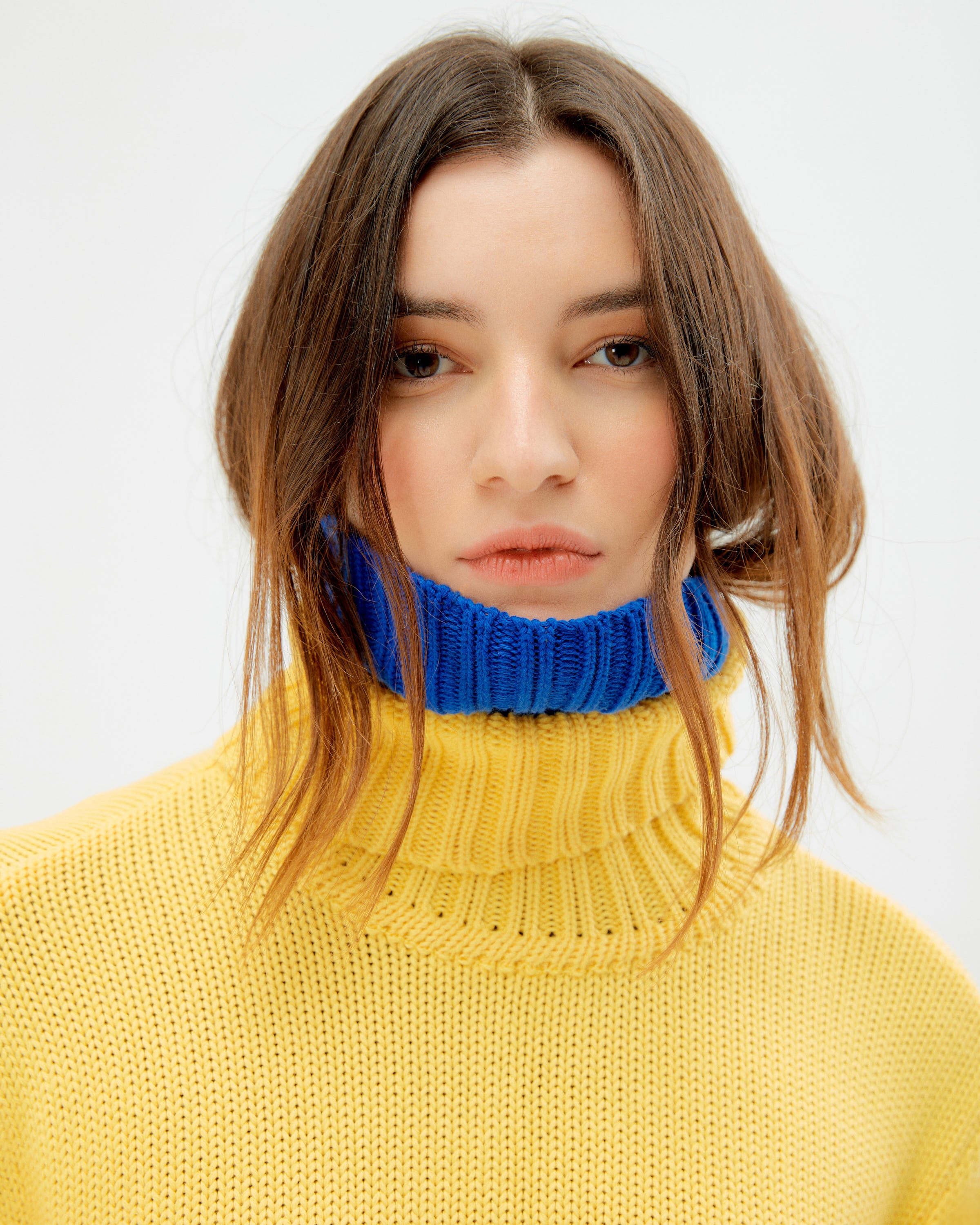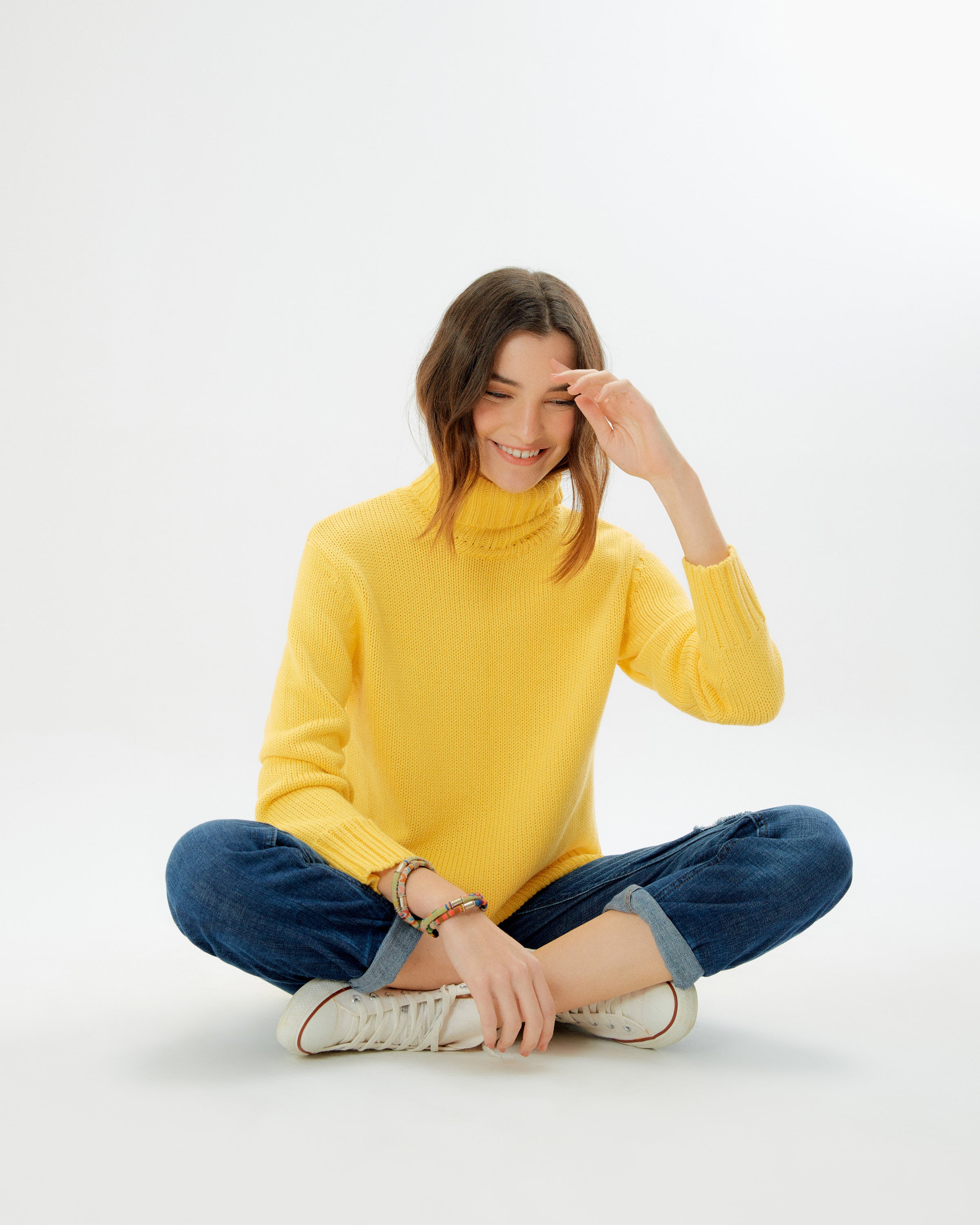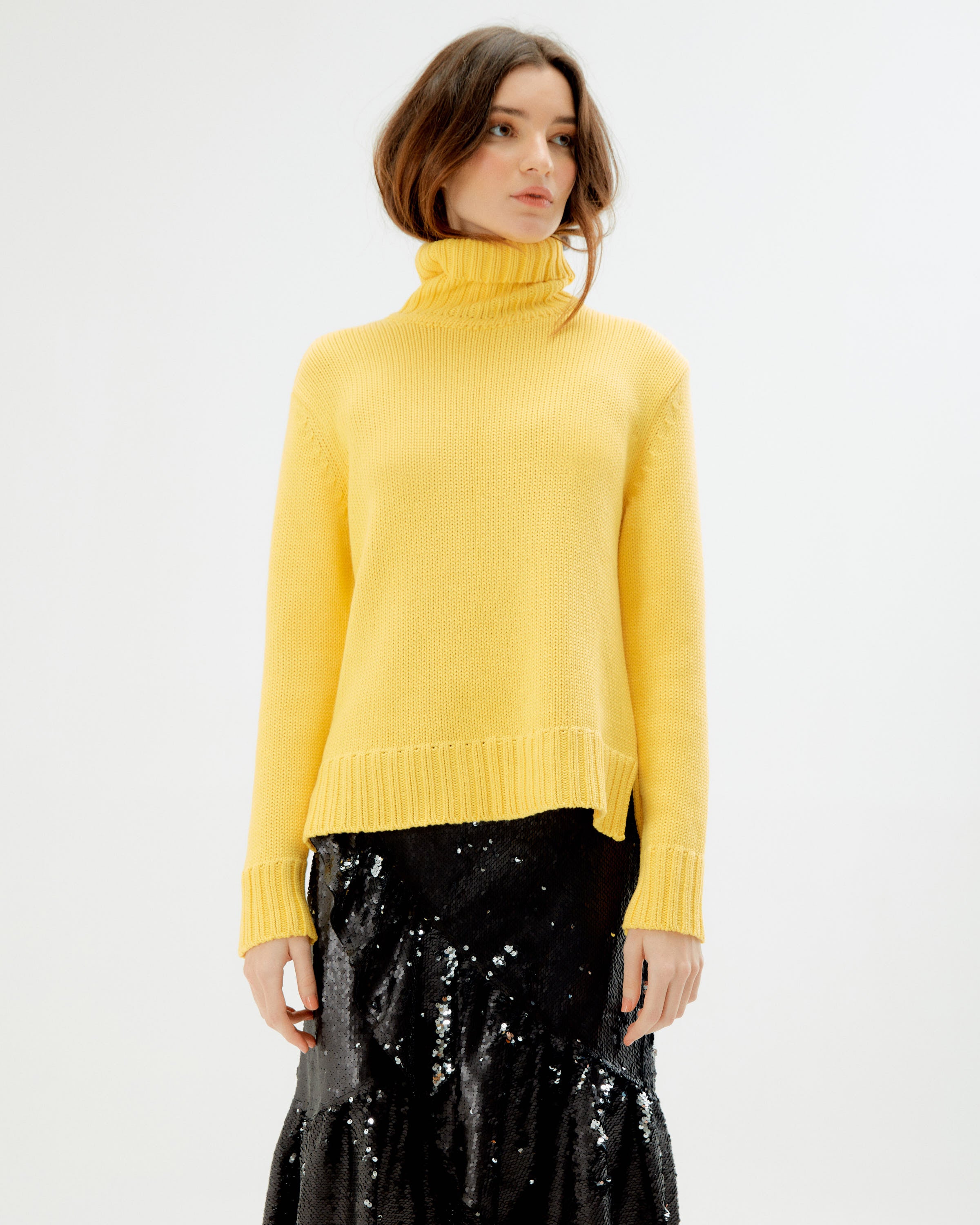 Handcrafted in the perfect hue of yellow, this rib knit will bring sunshine to your looks. Slightly oversized, it's the perfect companion to your every day jeans and pair beautifully with skirts and over dresses. With a chunky collar for extra cozy, you can leave it unfolded around your neck for a casual, understated look or gently turned down for a more pulled together feel. The side slits help you style it tucked in or loose for more easy styling options. The shoulders are gently dislocated and the sleeves are long enough to wear them folded.