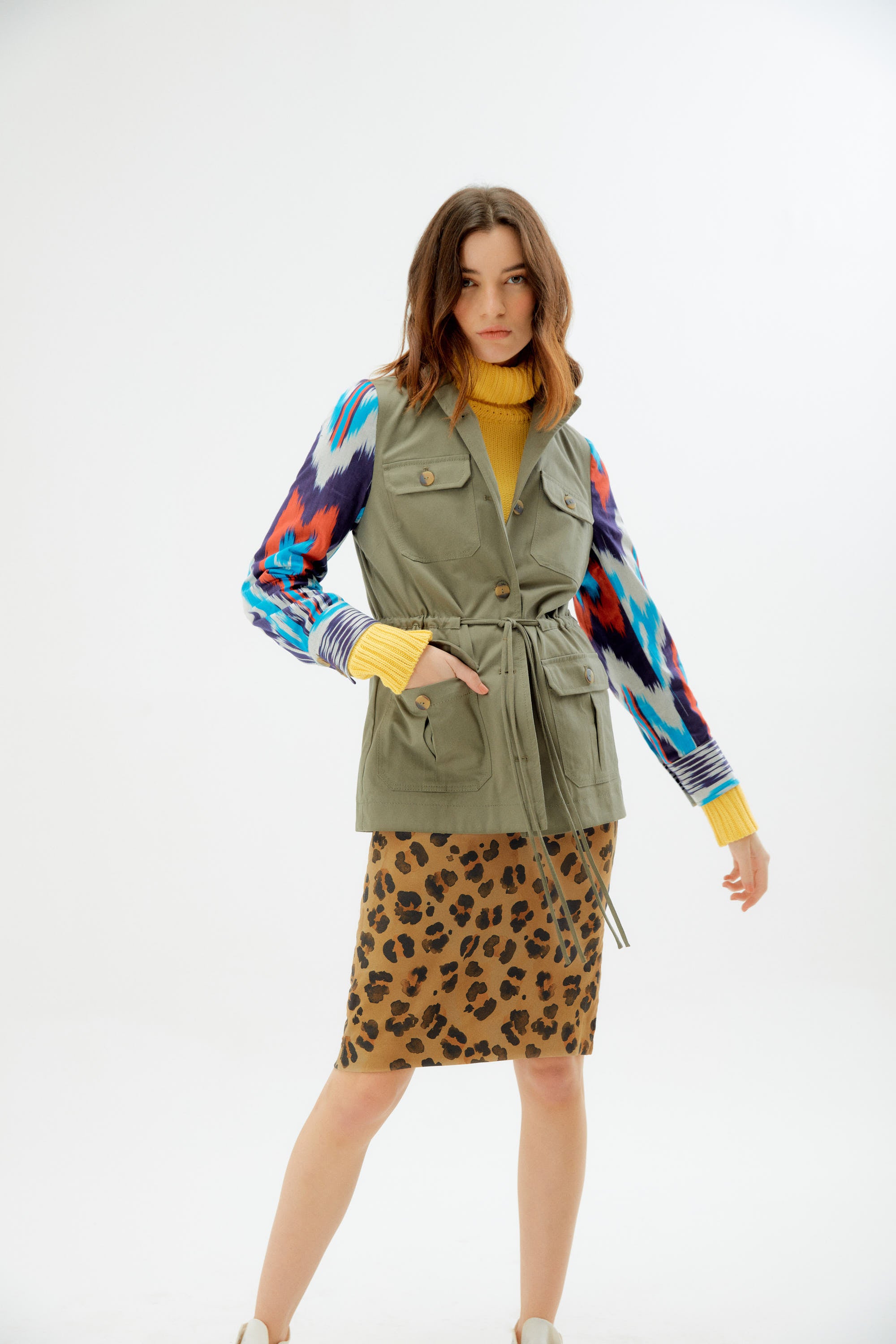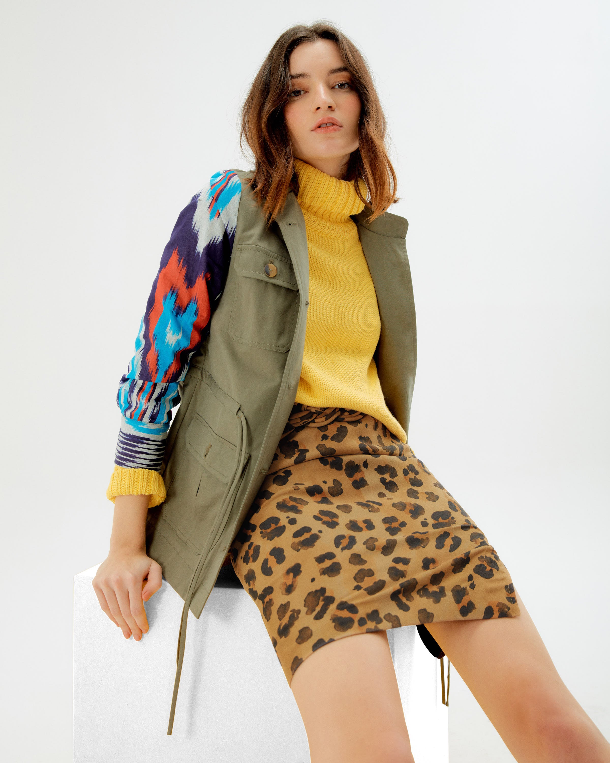 Cut in a pencil silhouette, this crepe skirt is designed in our hand painted, water color leopard print. Fitted to be a perfect pair from meetings to date night, it features a hand made belt that cinches at the waist and adds style and sophistication to this classic piece. A side slit helps you move comfortably while looking elegant and stylish. Pair yours with tucked in tops, like a white button down for a chic, easy look or a knit sweater for a cozy, seasonal feel.