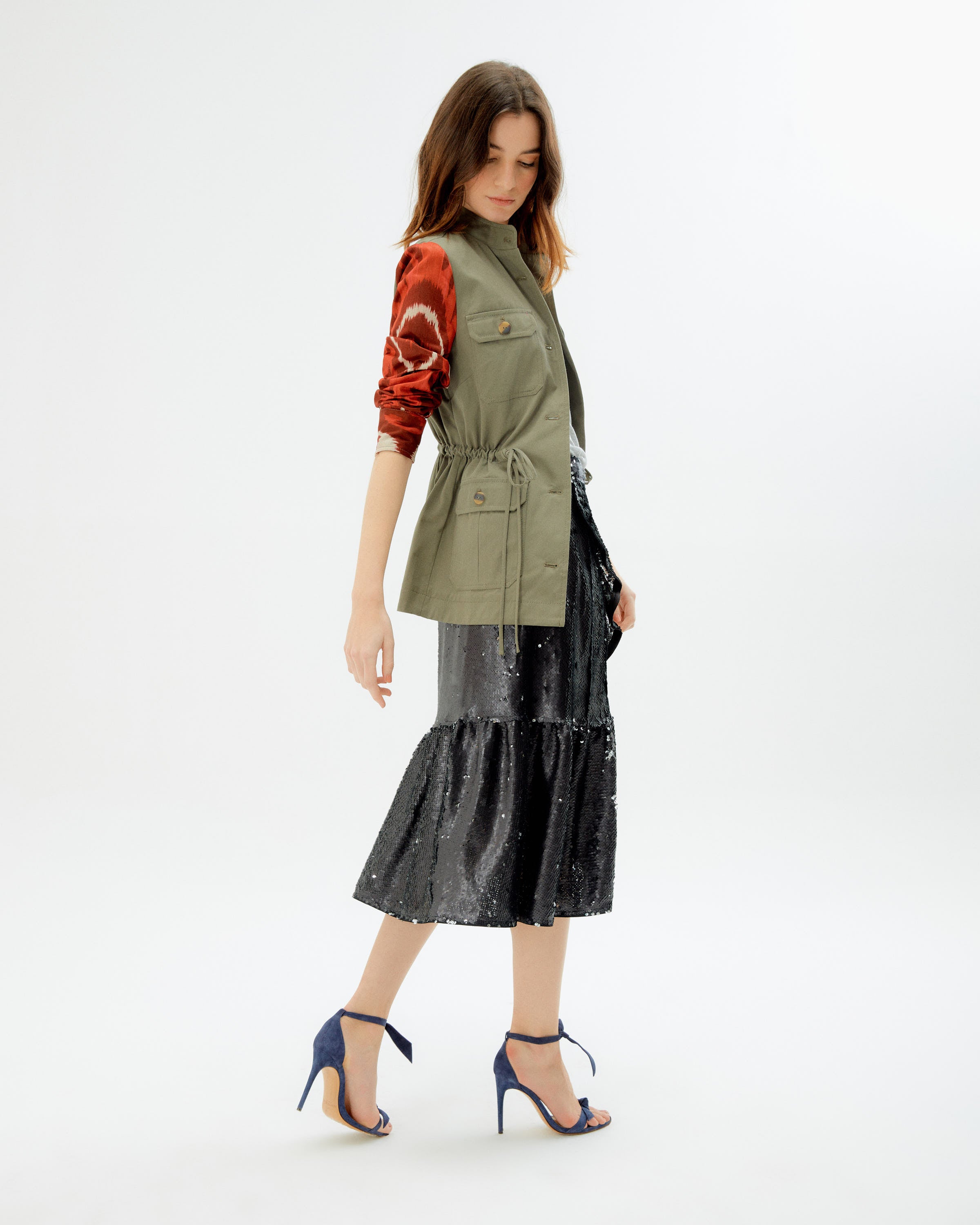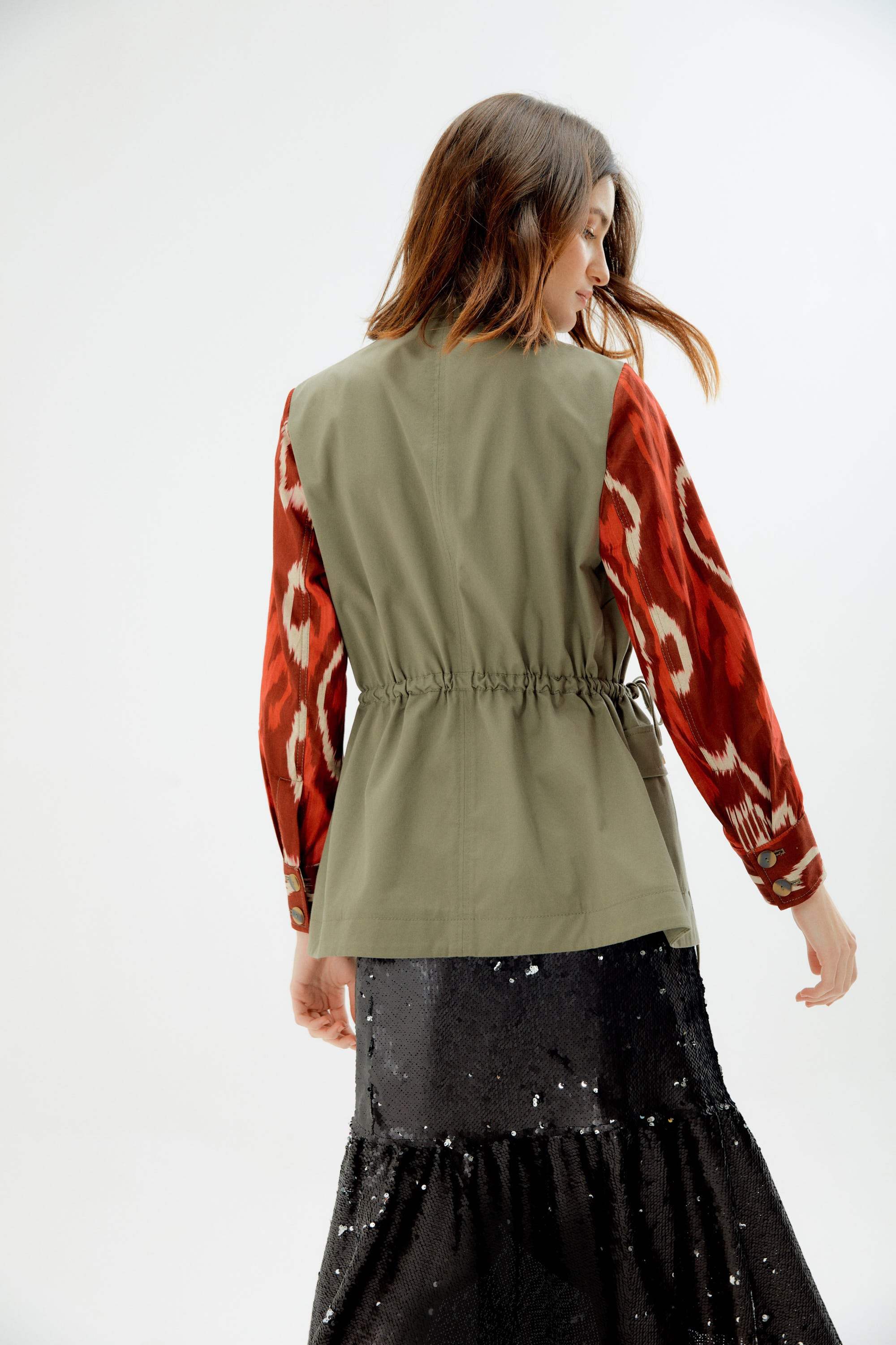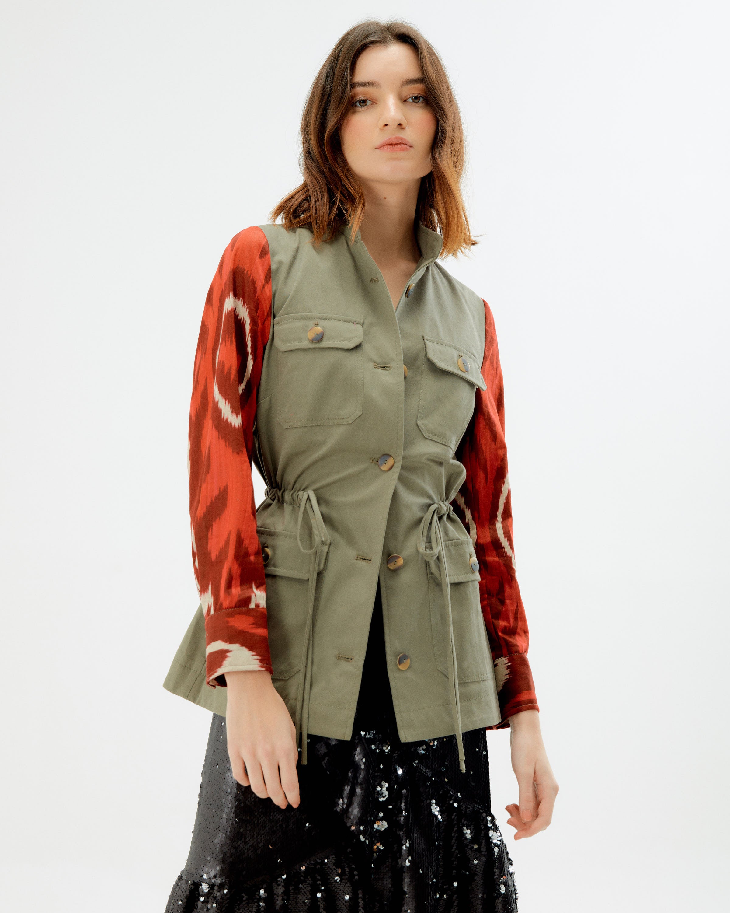 We never met an Army inspired jacket we didn't like, but this one is our "Pièce de Résistance". With sharp tailoring, this utility jacket features sleeves cut from handmade and hand dyed Ikat cotton, making each piece one of a kind and special. Perfect for layering over sweaters, cable knits and your favorite graphic tee, it has a slightly roomy shape that can be cinched at the waist for a more fitted look. This piece will become an instant wardrobe staple that you will want to wear again and again.