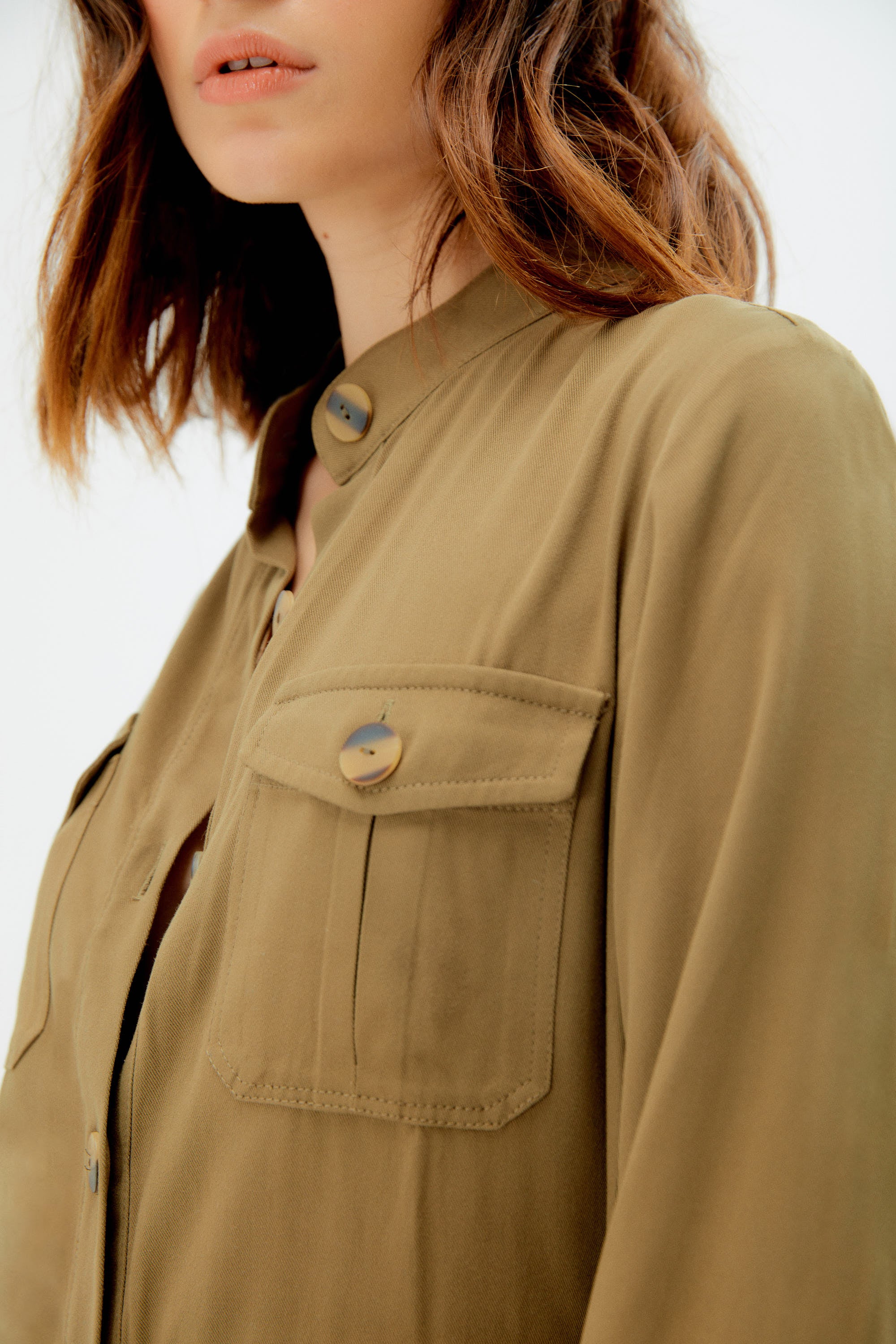 There's a reason why jumpsuits are our favorite, not only they are easy, chic pieces that look good on everyone, they also cut the time to choose an outfit in half. With a strong nod to workwear, this army inspired jumpsuit is cut from the most soft twill with details that will make it your go-to look. Relaxed and effortless but with a waist defining button fastening, it can be worn loose or more fitted, giving you two options on the same piece. The standing collar gives a fresh look and the buttons up front add the right amount of sophistication. Style with boots for a grungy look, make it sexy with pumps or strappy heels and casual with sneakers.