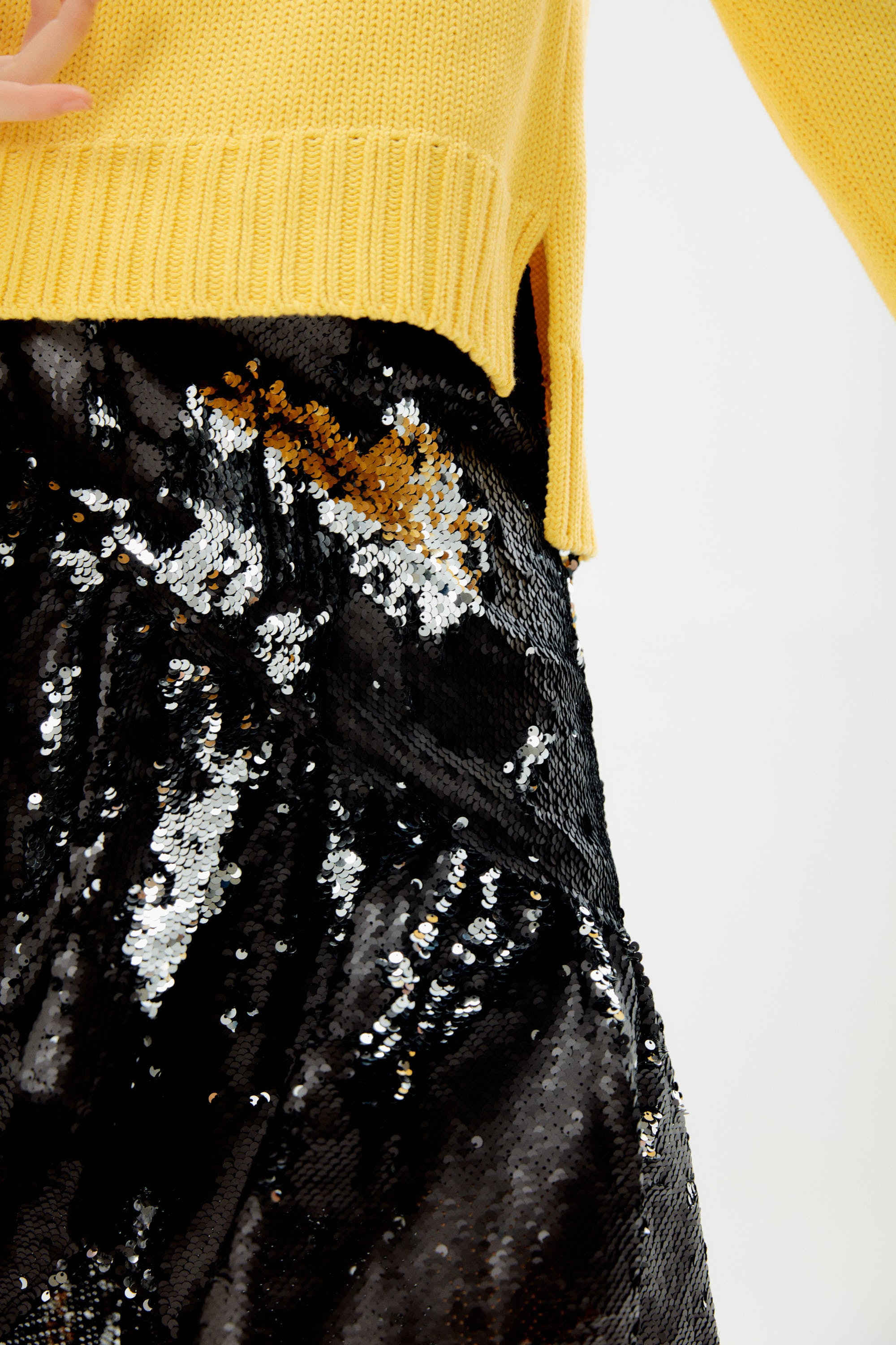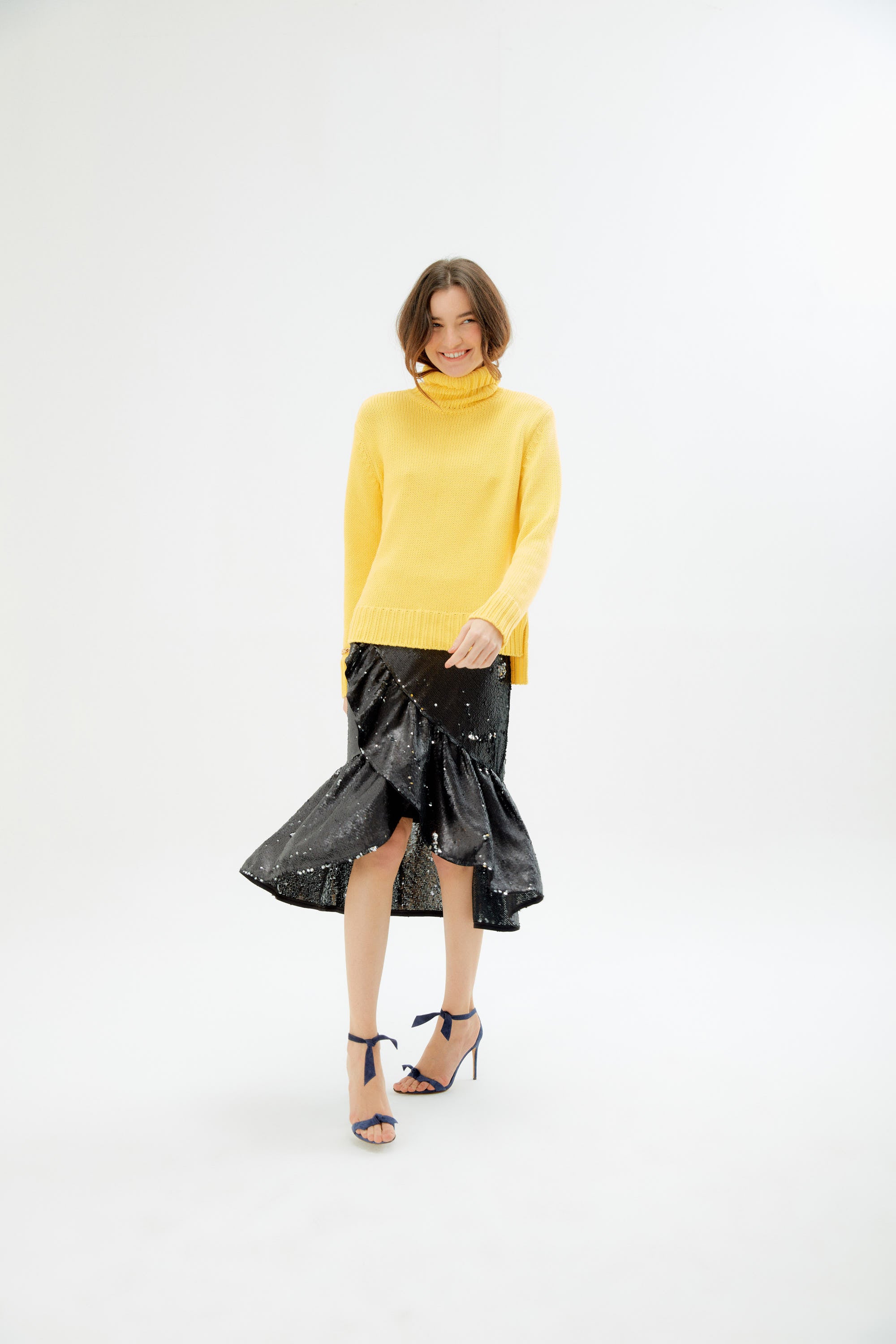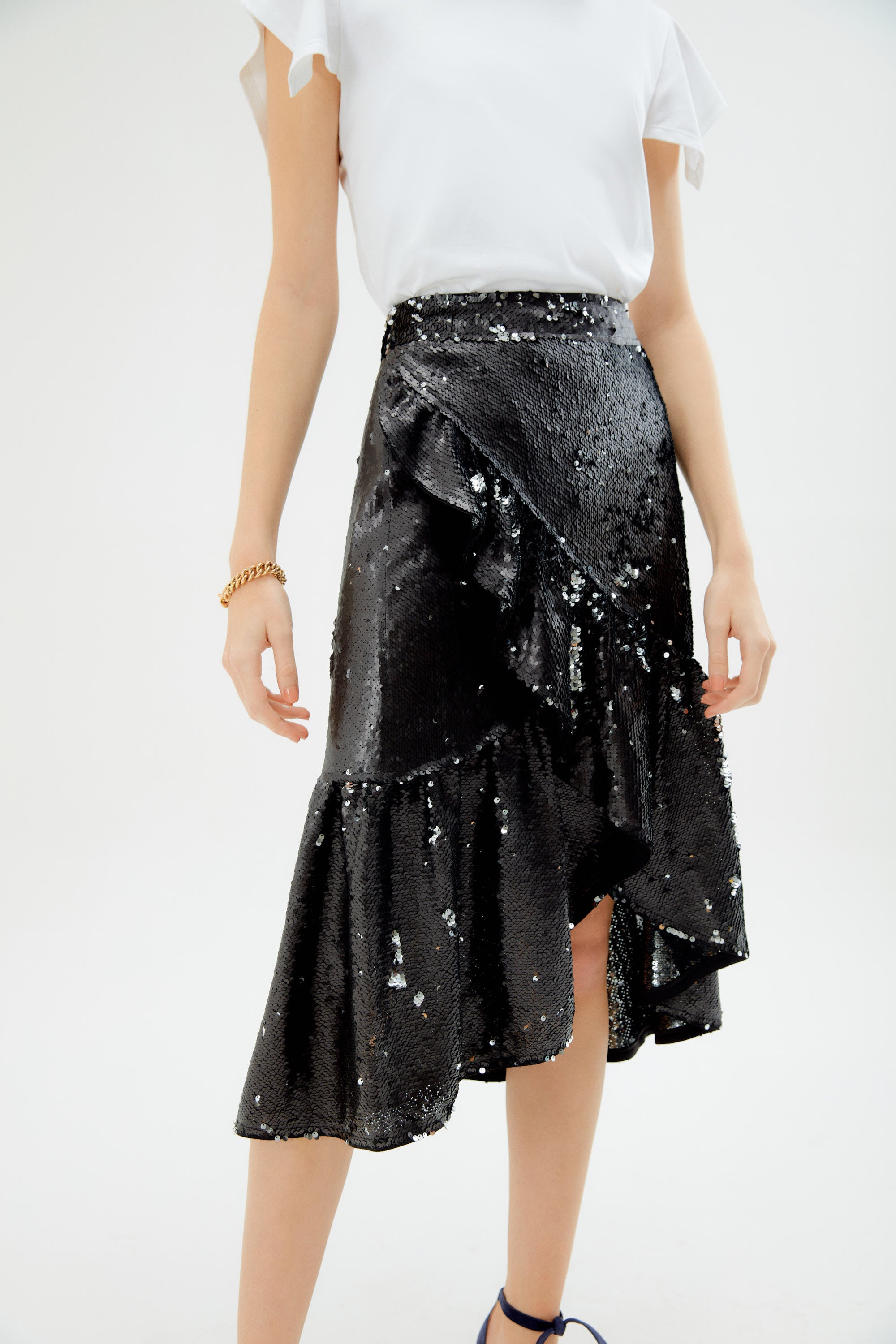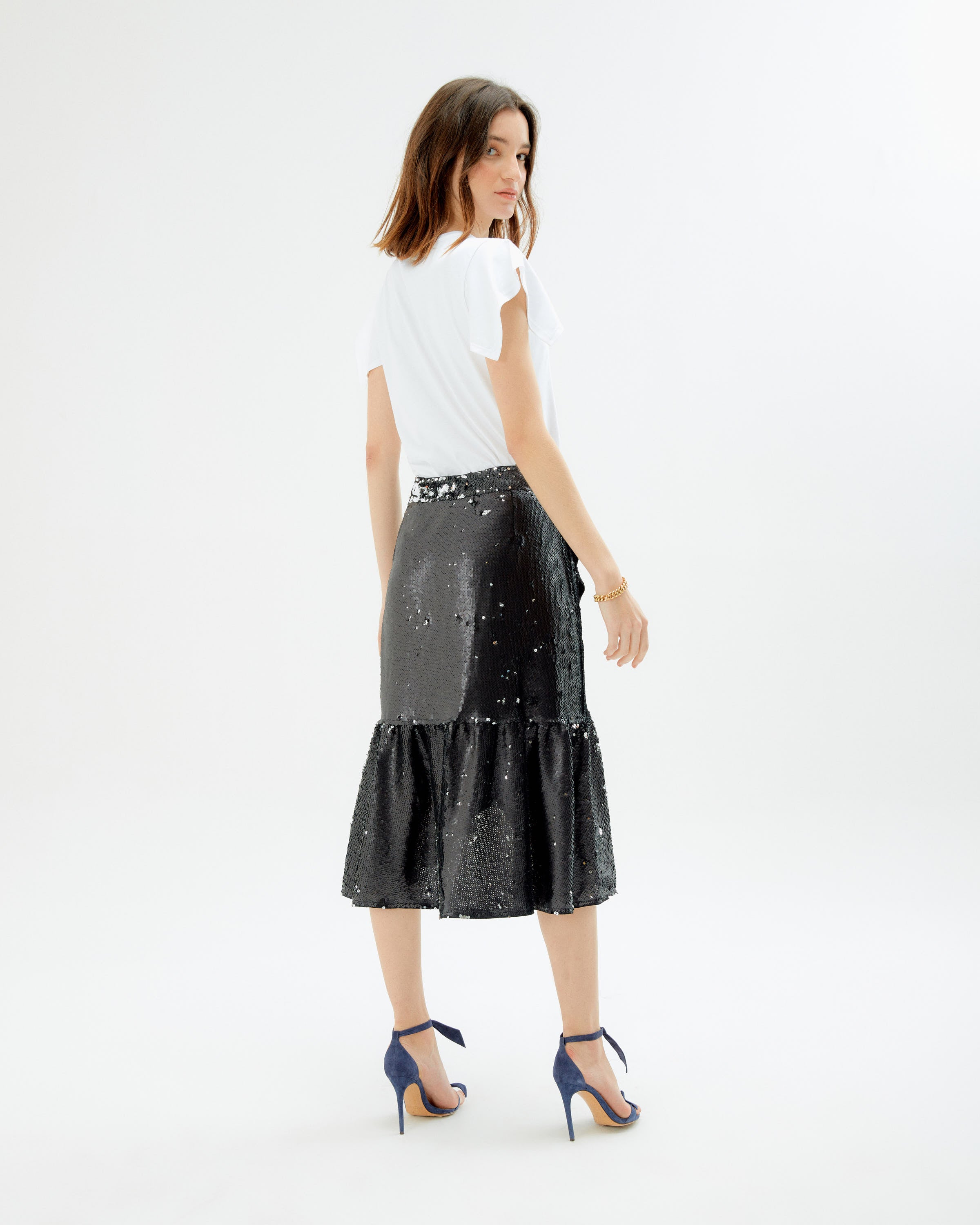 A party for the eyes, the Sequins Ruffled Midi Skirt is designed in festive black and silver sequins in a ruffled cut that will not make you go unnoticed. Style it with a white tank for a subtle unique look or with a glamorous top for the chicest cocktail atire. We also love styling it with a cozy knit sweater for a glam Holiday look.