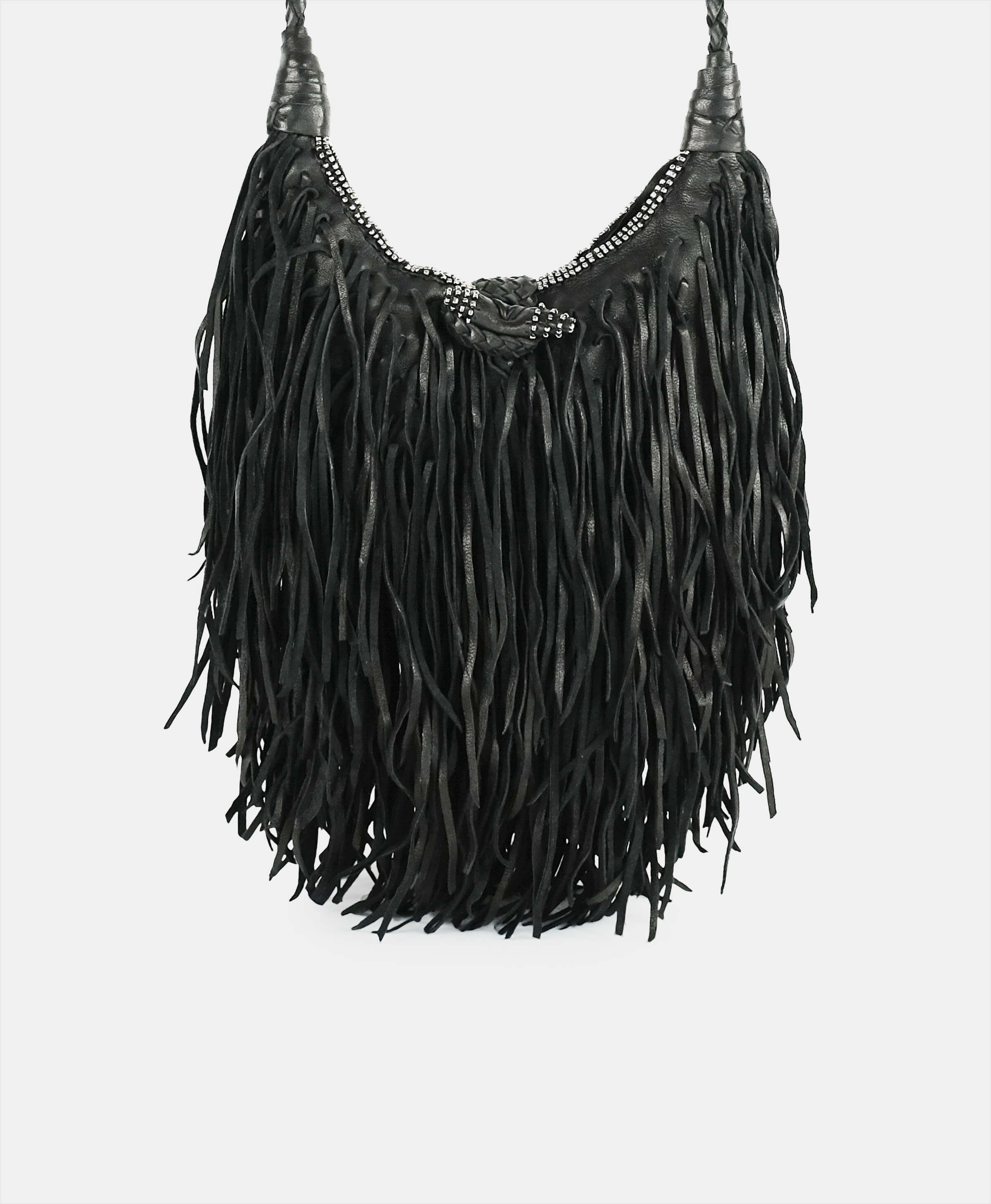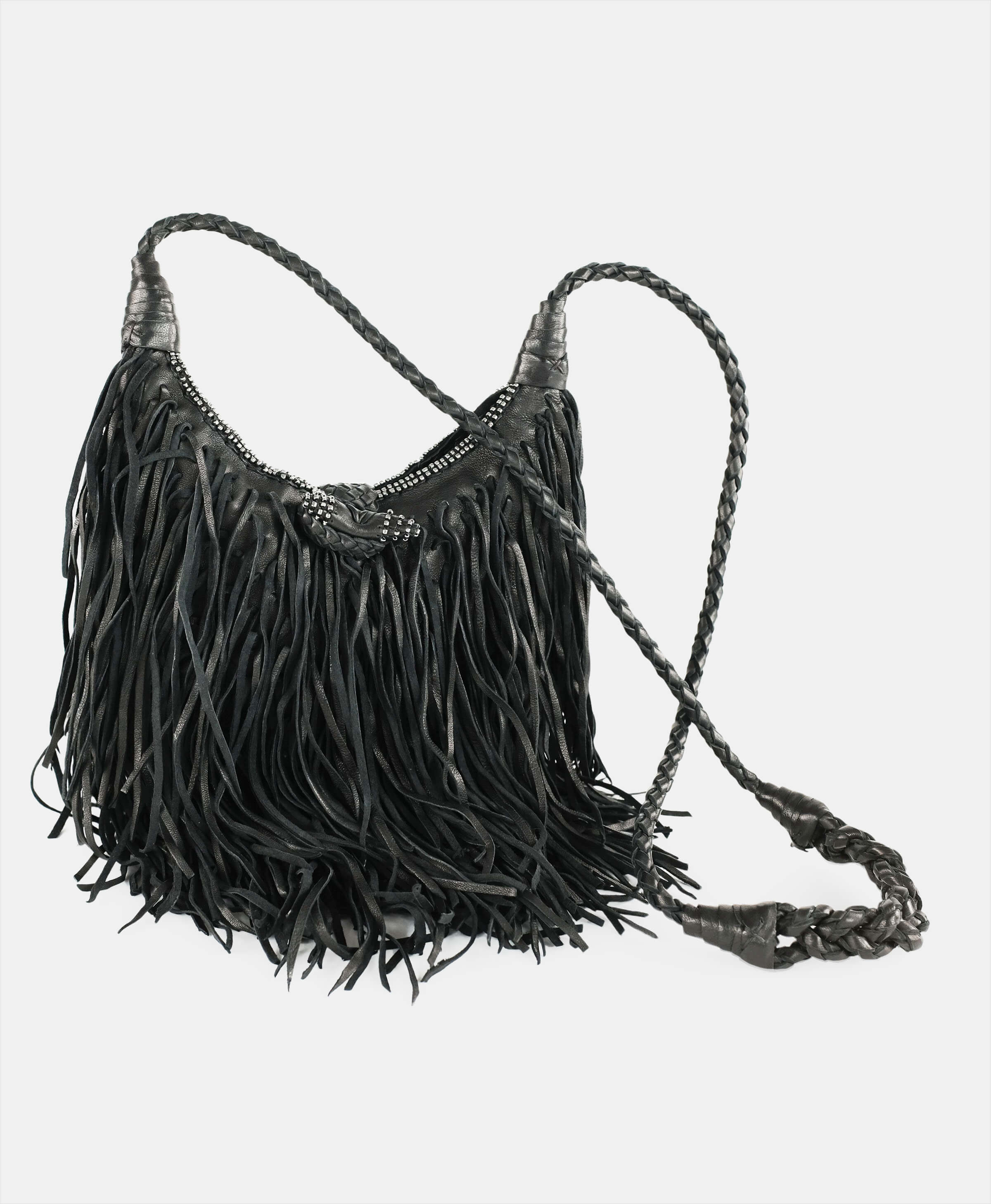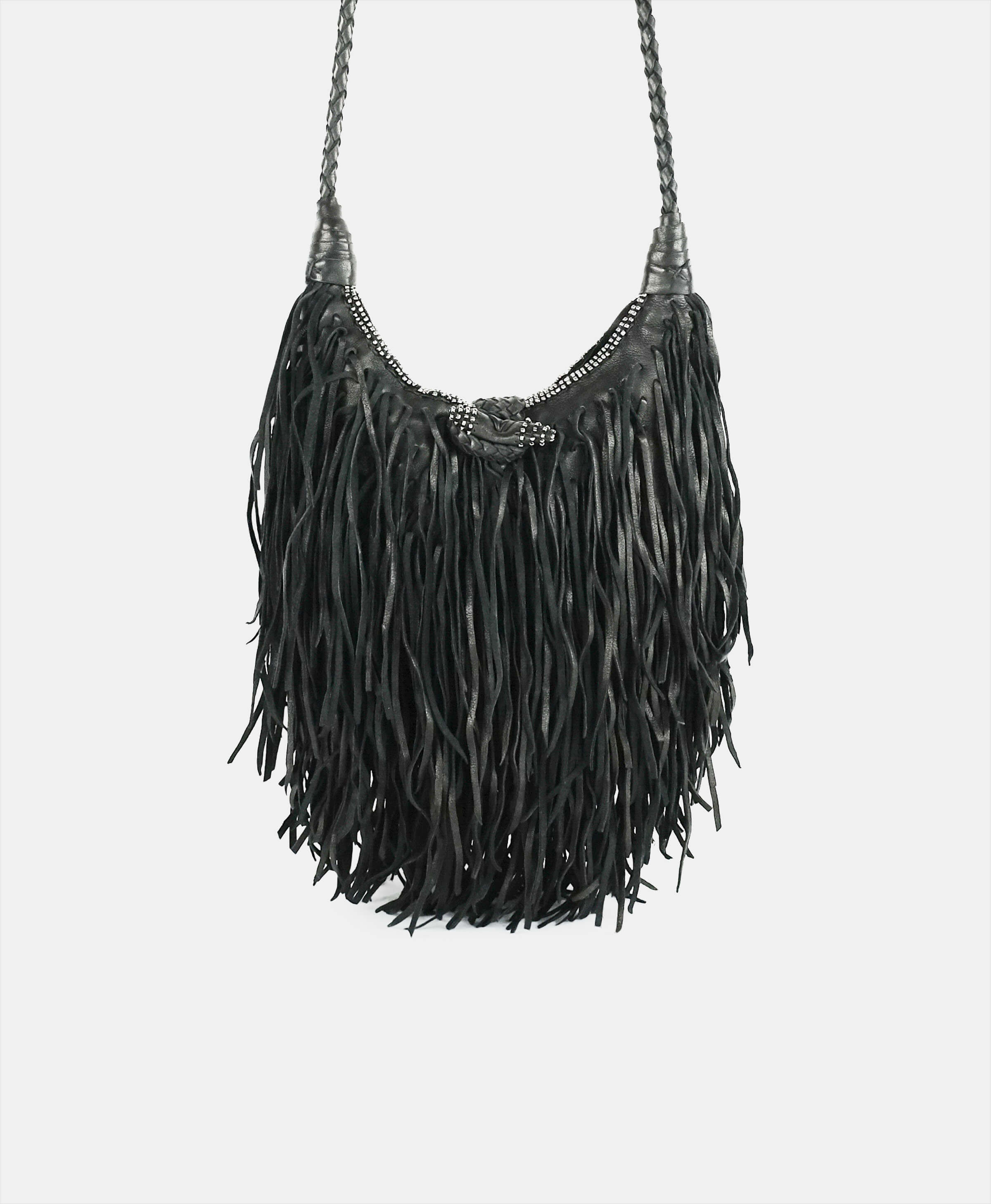 A smaller version of our fringe shoulder bag, this piece is adorned with hand embroidered beading across the opening. In classic black, this bag is perfect to carry your essentials to a concert or a night out.
