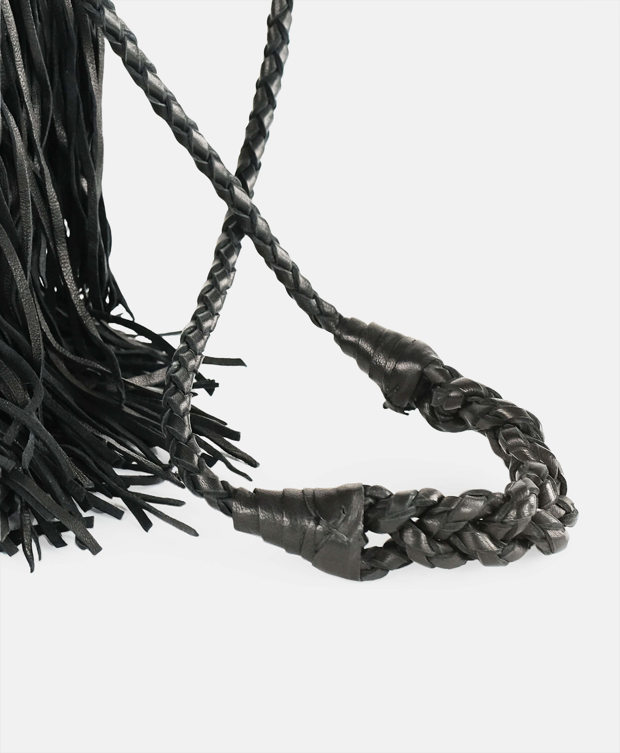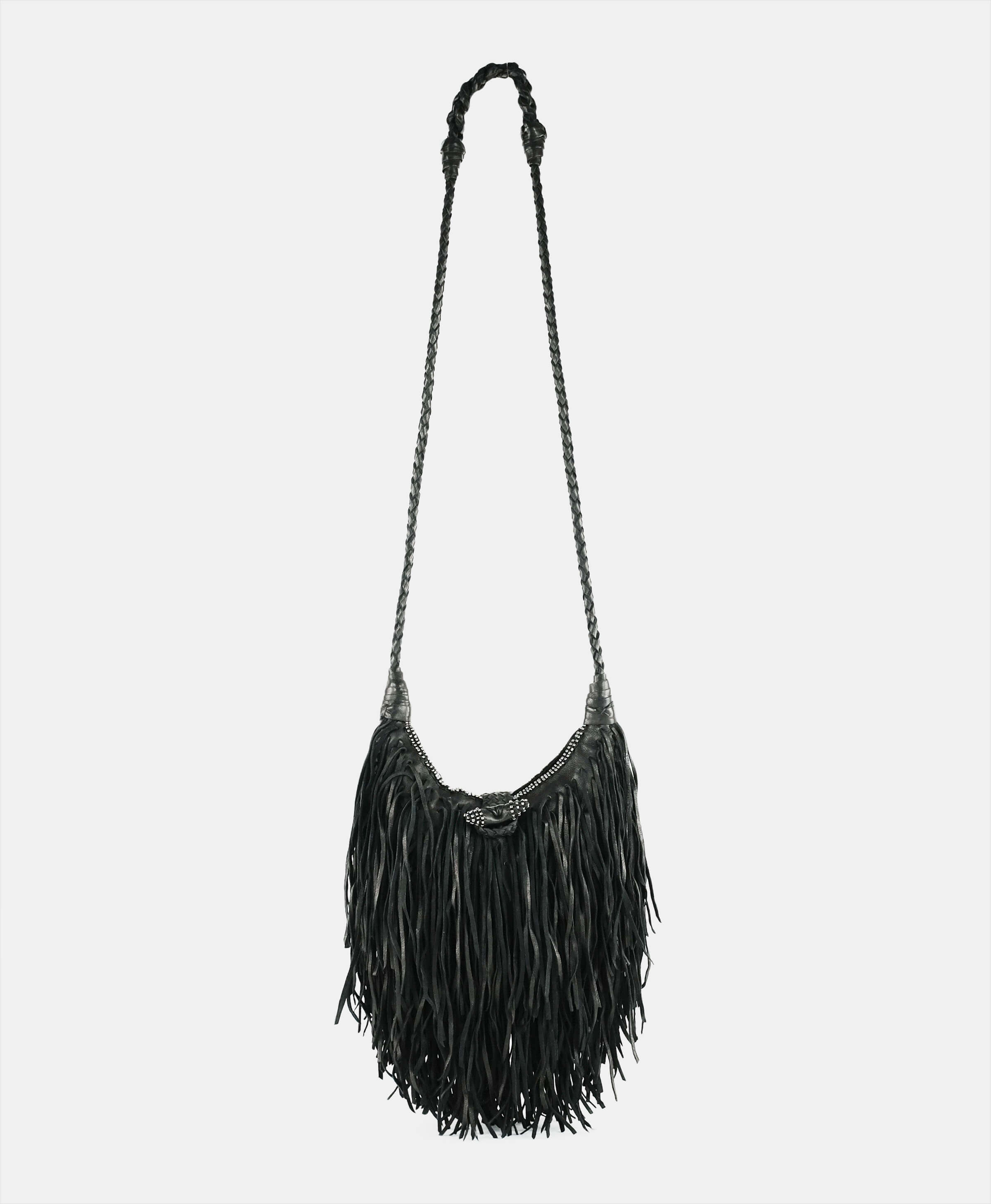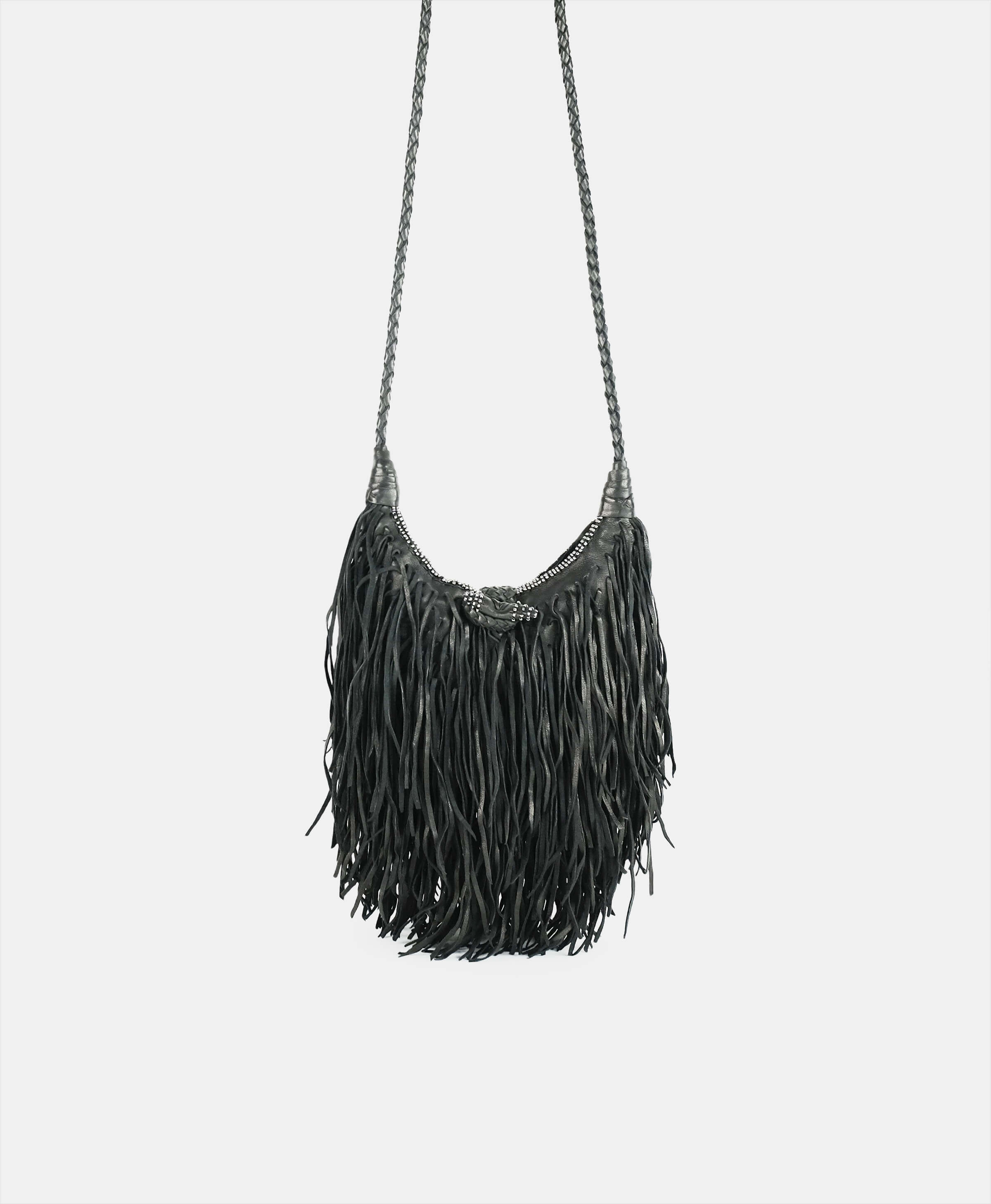 A smaller version of our fringe shoulder bag, this piece is adorned with hand embroidered beading across the opening. In classic black, this bag is perfect to carry your essentials to a concert or a night out.