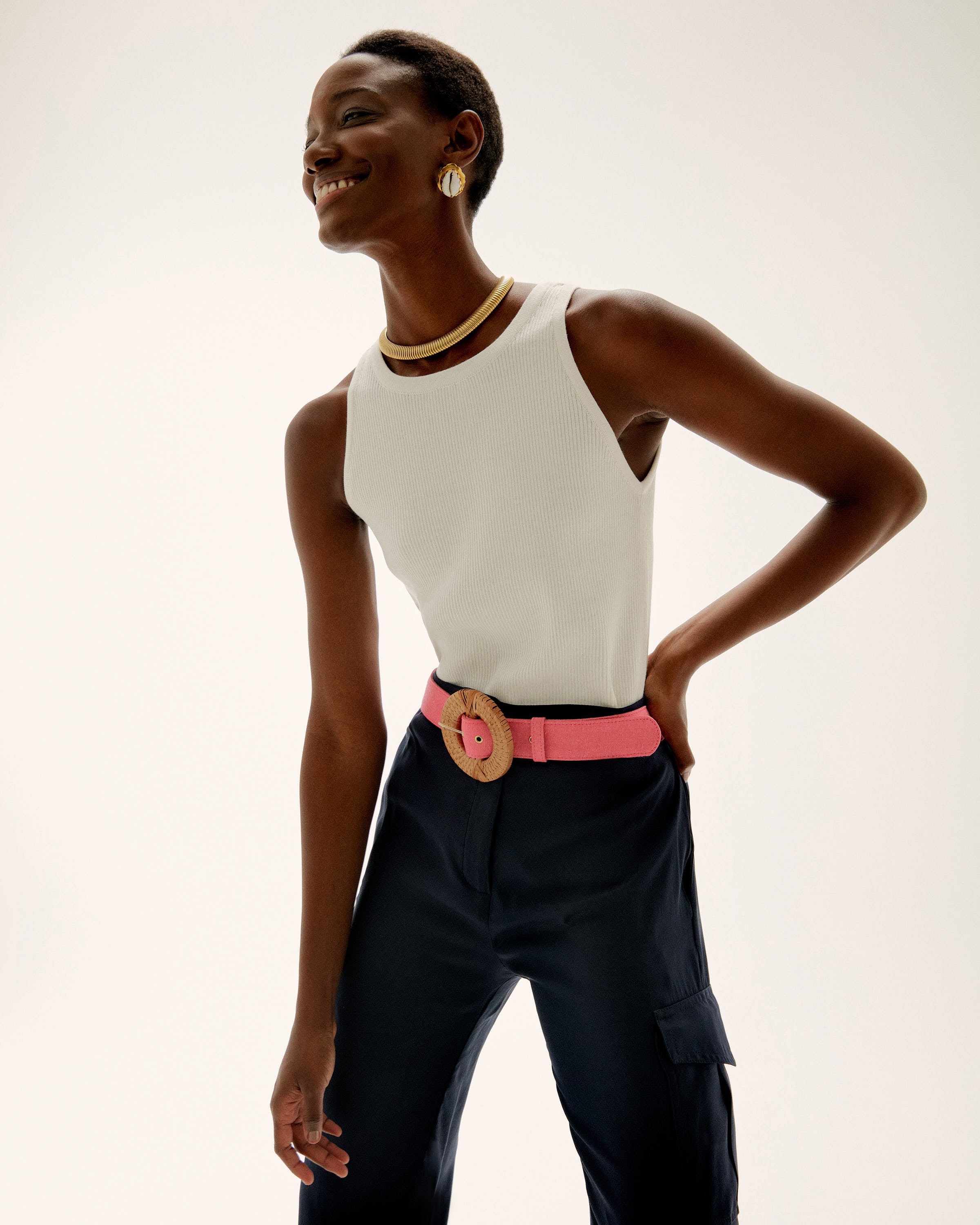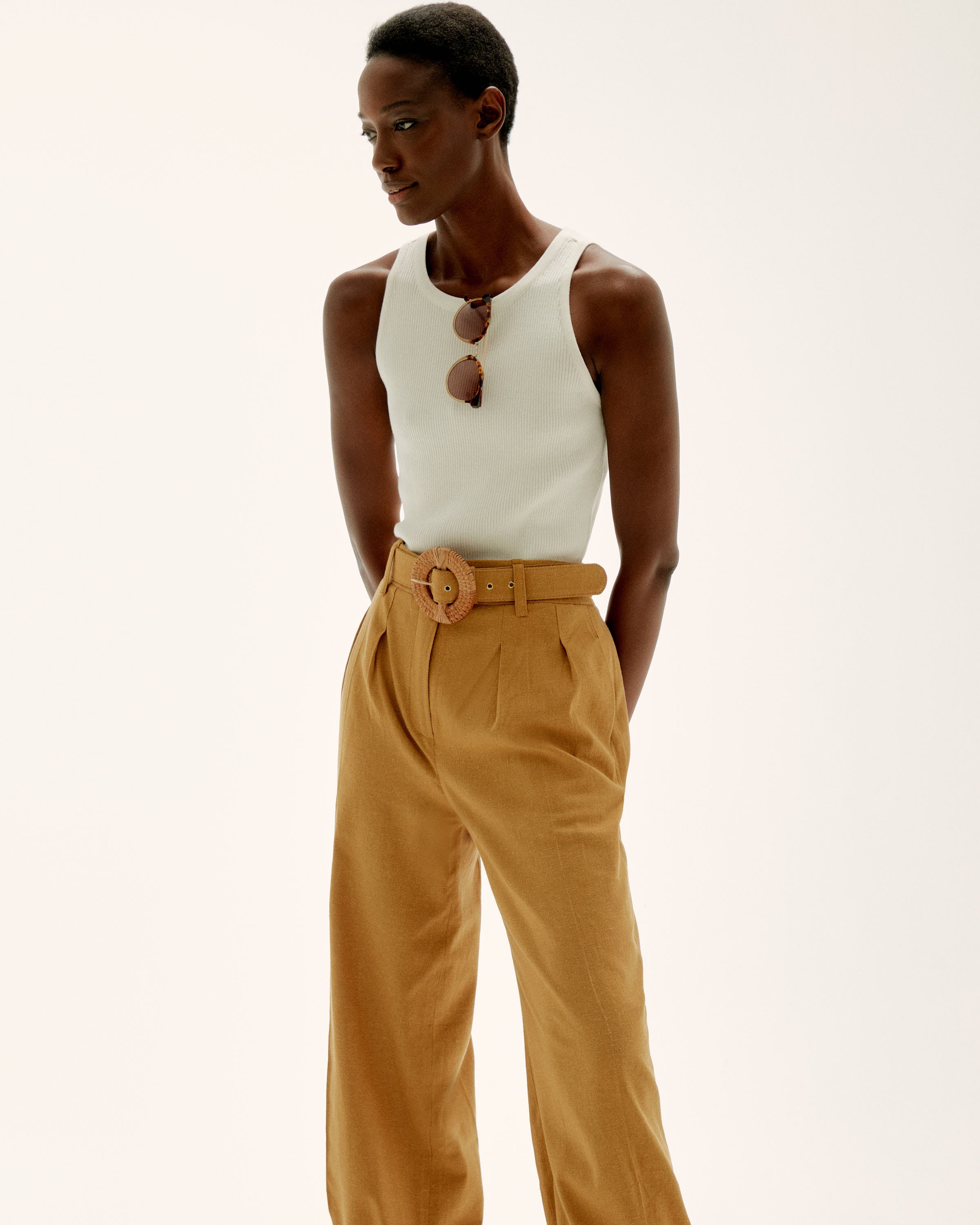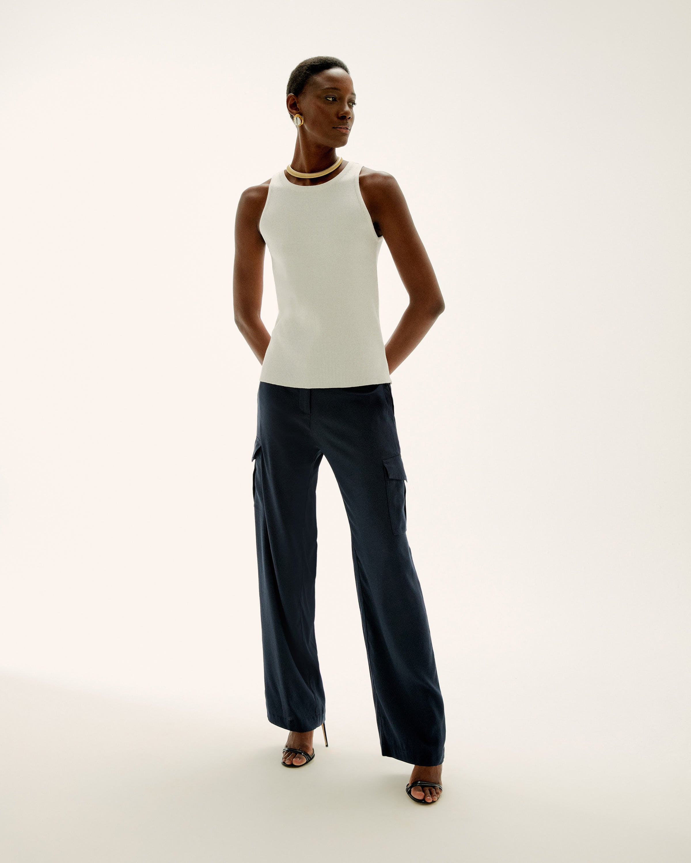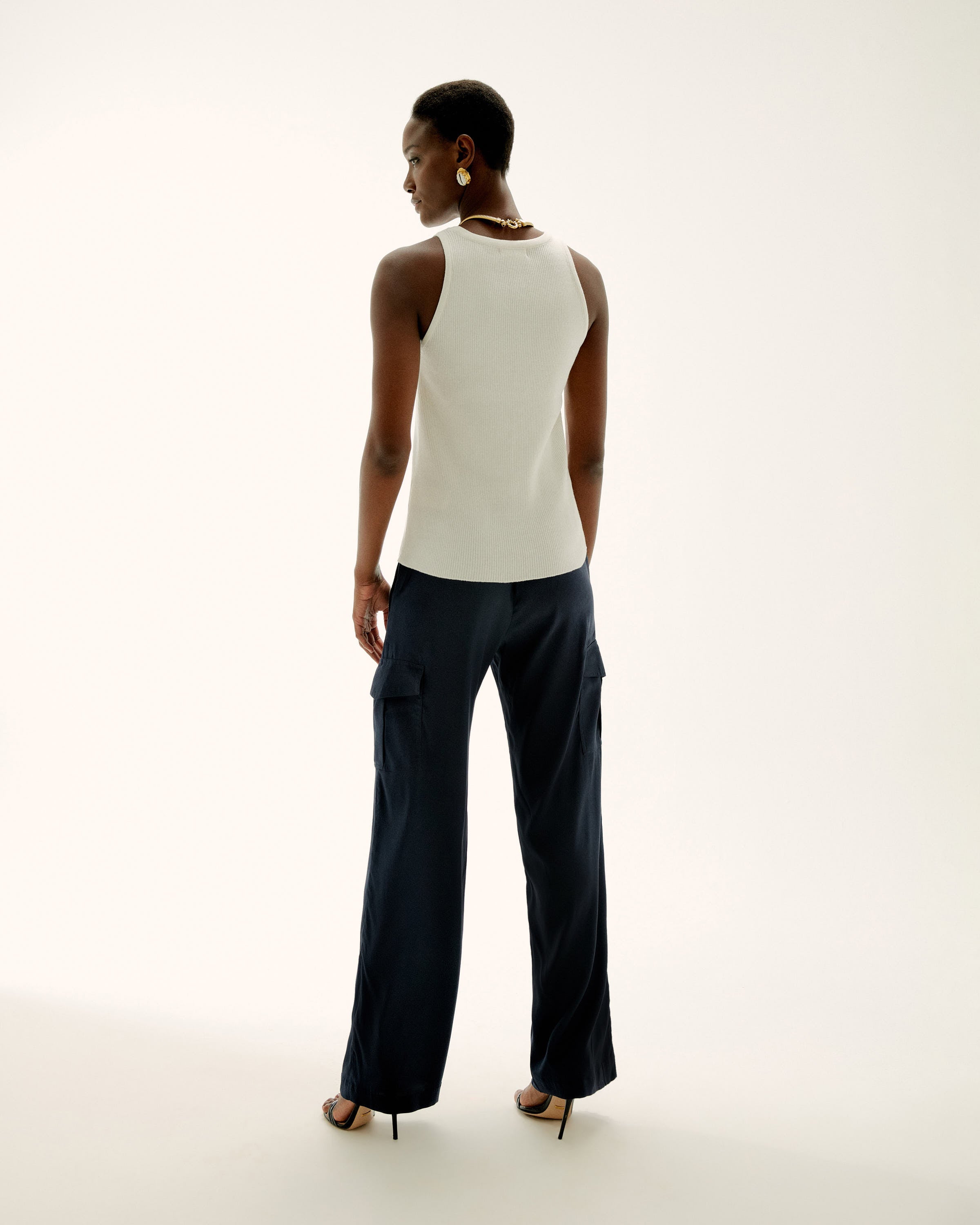 A luxurious base layer, the Sunny Knit Top is a perfect piece to bridge the gaps in your wardrobe. It looks great under blazers, jackets and cardigans and the soft ribbed knit adds elegance to the fitted silhouette. In a rich off white hue, this style is endlessly versatile and will be your to-go piece for easy dressing. You'll wear it now and forever. Style with the line's silk cargo pant for an elegant weekend outfit or pair it with jeans for a minimalist look.